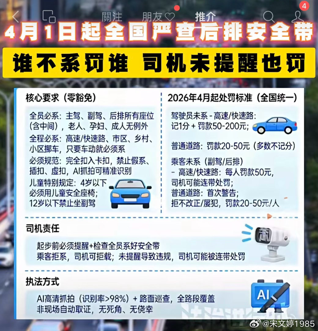 《道路交通安全法》51条明确规定:开车人、乘客都得系安全带。只不过以前不怎么抓,今天开始严!查!真的是好事。强烈建议:高速快车道上的龟速车也一起严查了!!!还有什么得一起严查的?大家帮忙补充…4月1日起全国严查后排未系安全带
