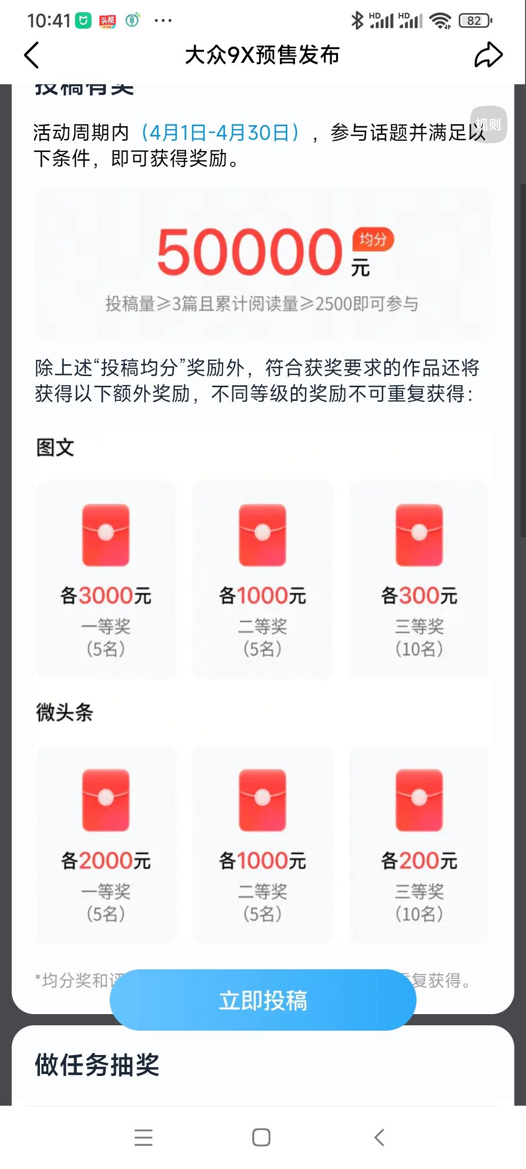 大众9X预售发布活动广场又来新征文了“大众9X预售发布”征文今日开始,为期一个月,写三篇,阅读量2500即可瓜分50000元奖金,还有等级奖,另外做位务还可以抽奖,快写起来吧,一起加油哦[作揖]