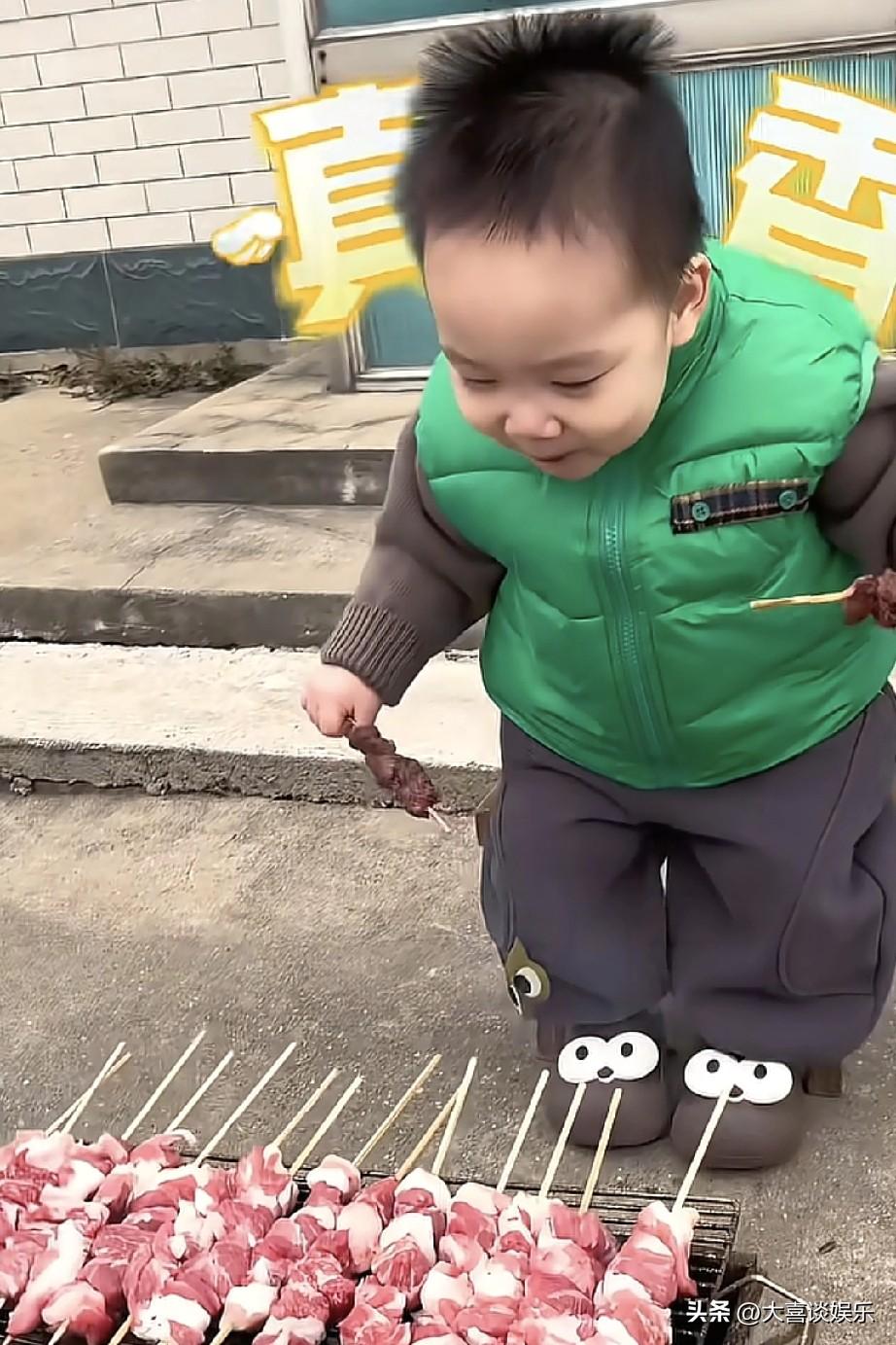 手里拿着两个还盯着烧烤架上的,恐怕不够他吃的样子,太招人稀罕了。