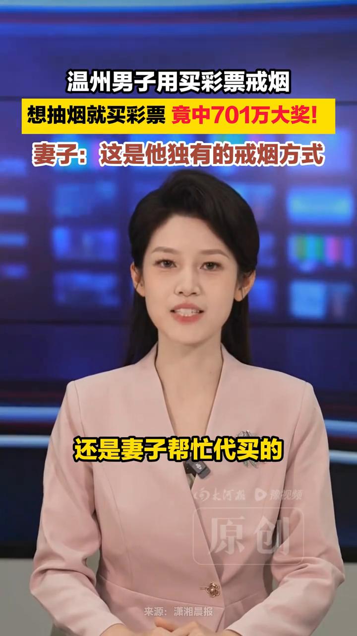 温州男子用买彩票戒烟,想抽烟就买彩票竟中701万大奖! 潇湘晨报。 温州男子用买彩票戒烟,想抽烟就买彩票竟中701万大奖。近日浙江温州彩民曾先生(化姓)喜中大乐透一等奖。妻子表示买彩票是老公的独家戒烟方式,想抽烟就不买烟,直接换成彩票。没想到坚持多年竟喜中701万大奖。中奖彩票还是妻子帮忙代买的,如今健康和好运都有了,简直是人生赢家。 编辑:吴姝霖。