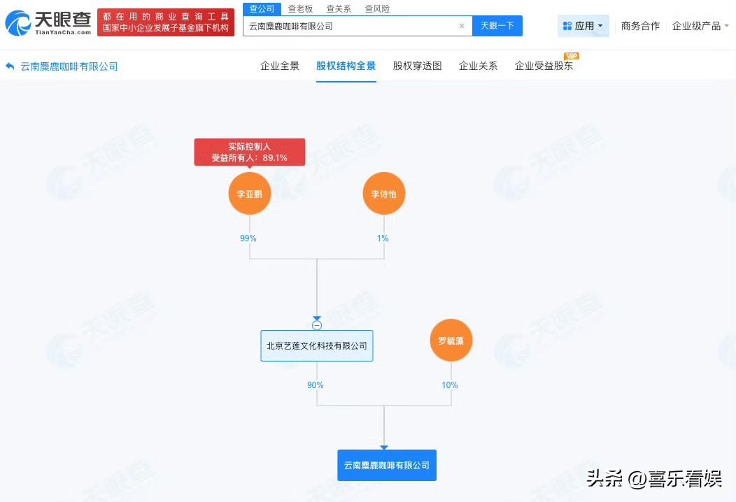 从股权穿透图能看出来,李亚鹏名下的北京艺莲文化科技有限公司占了90%股份,是绝对大股东,剩下10%由罗毓藻持有。