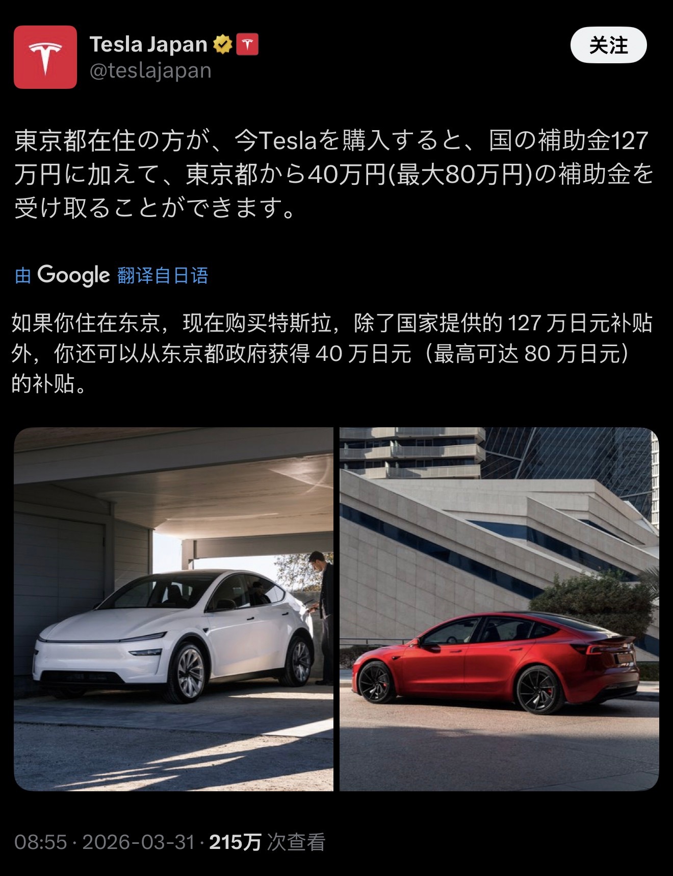 日本这补贴也挺强啊,原 500 多万日元的 Model 3,补贴后是 300 多