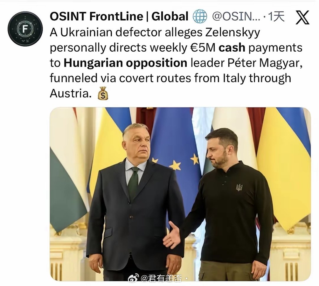一名乌克兰情报官员逃到了匈牙利,爆出内幕:从2025年11月开始,泽林斯基每周给匈牙利的反对党500万欧元现金,作为他们竞选经费,希望大选中(4月12日投票)打败保守派政府。奥尔班总理发表讲话:匈牙利不会被泽林斯基们打倒,要捍卫自己国家主权。前一段泽林斯基的武装运钞车在过境匈牙利时被截扣,车里有8000万美元现金和9公斤黄金。9名押送人员后被释放,但钱仍在扣。两国关系急剧恶化。