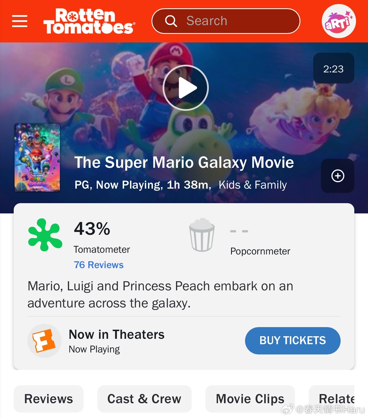 《超级马力欧银河大电影》媒体口碑解禁,烂番茄新鲜度43%,MTC评分37。上一部烂番茄新鲜度59%,MTC46,不过观众的爆米花指数挺高的,高达95%