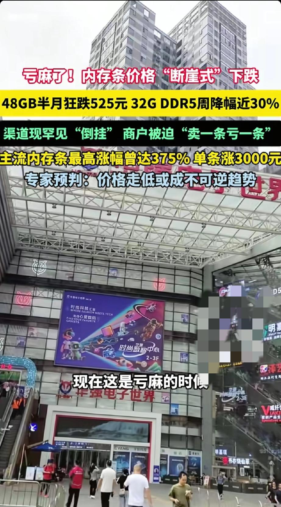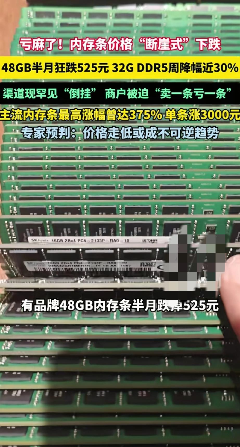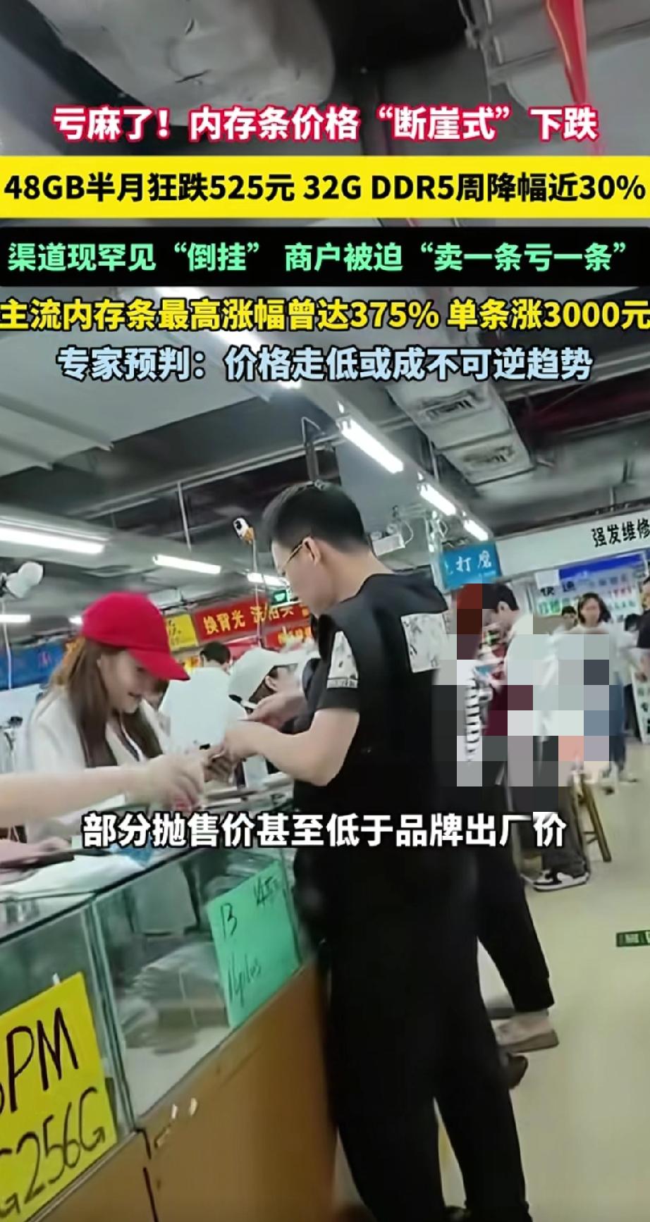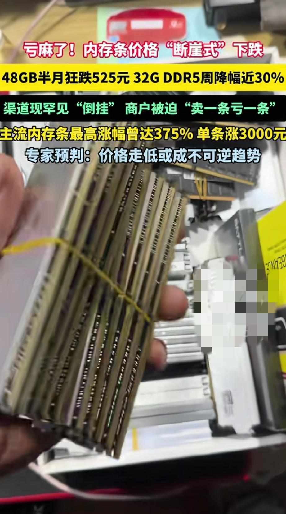 价格断崖式下跌!有商家直呼亏麻了:至少亏损几十万元,网友:肯定还会跌,再等等。 “内存条价格断崖式下跌”话题冲上热搜,网友直呼“等等党赢麻了”。某二手平台数据显示,内存条近7日成交均价较前一周跌50元,DDR5跌20元。华强北出现抛售行情,32G DDR5内存条降幅500 - 1050元不等,有商户抛售价低至1950元/条。 有商家称虽不会一天跌几百,但亏麻了,至少亏损几十万。对于后市,商家看法不一,有的觉得还会降,有的认为因上游价格支撑,降价或难持续。这内存条市场真是风云变幻,苦了商家,乐了等降价的网友。 内存芯片行情 内存条价格疯涨 内存条行情 内存走势 内存天价 内存条回收价格 天价内存条
