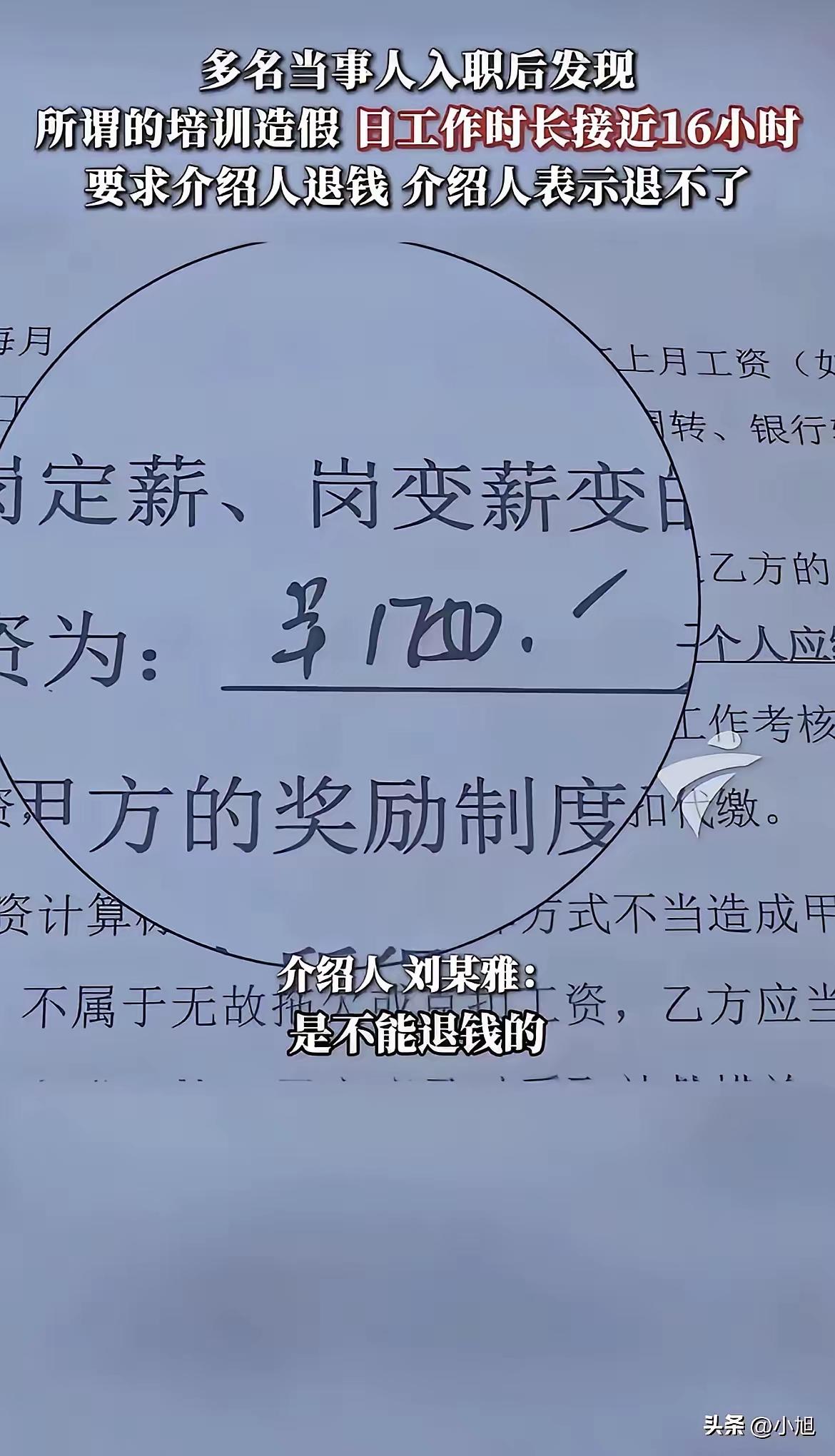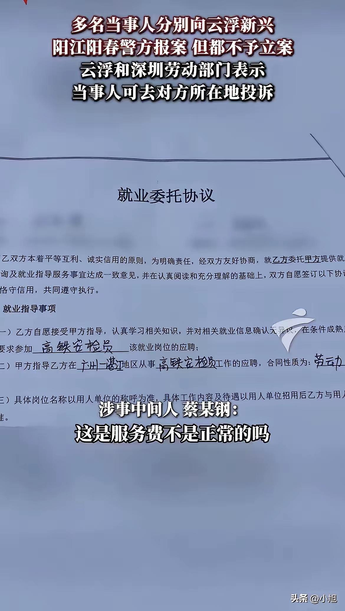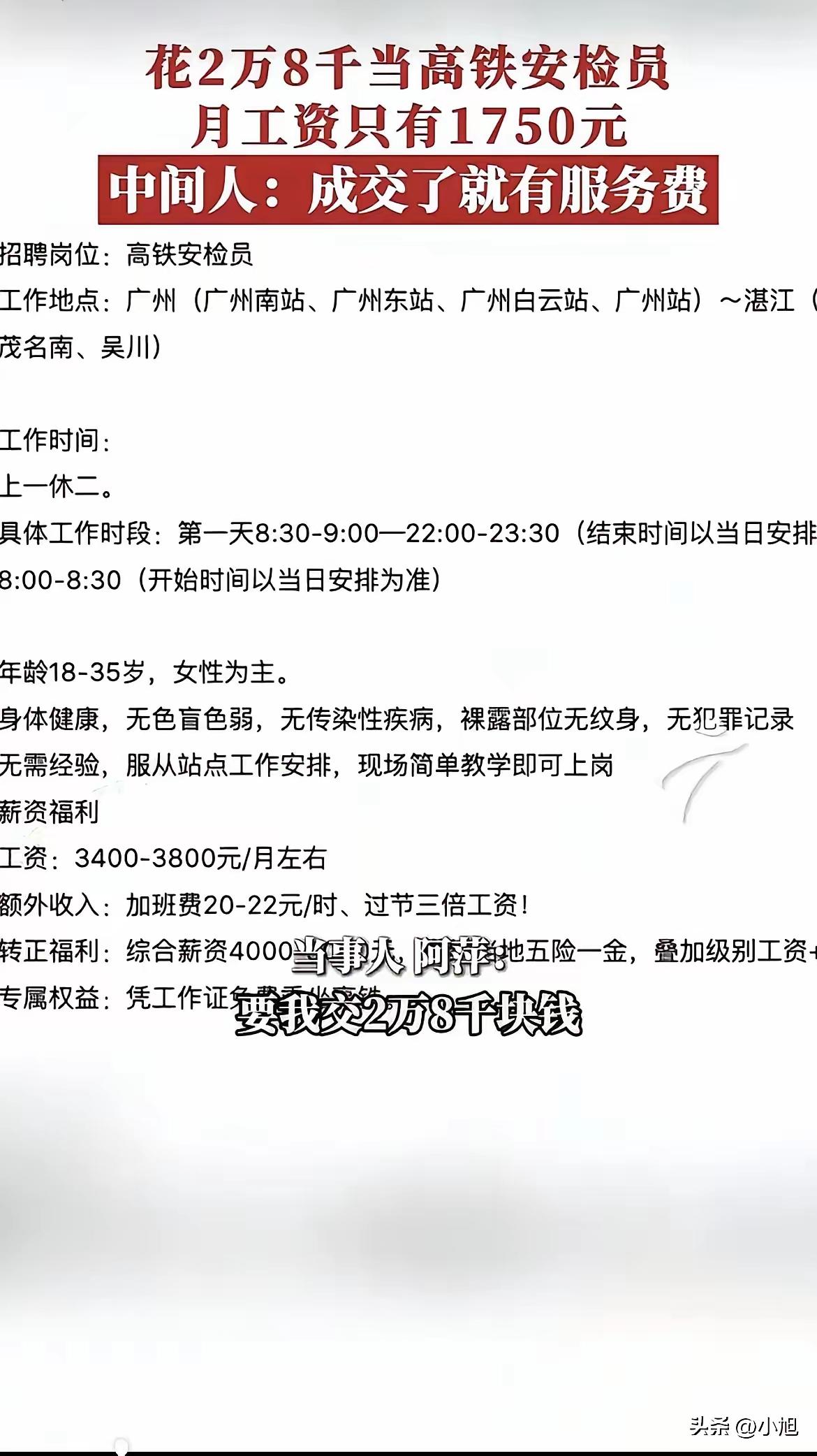 广东阳江阳春高铁站惊天骗局!花2万8血汗钱买“铁饭碗”,竟沦为日站16小时月薪1750的“现代包身工”,黑心中介卷款跑路,打工人的活路在哪? 当28岁的阿萍把攒了五六年的两万八千块钱,咬牙转给中介刘某雅时,她以为抓住了一根救命稻草。同乡信誓旦旦的保证犹在耳边:国企高铁安检员,五险一金,月薪四五千,包吃住。这对于一个普通打工妹来说,无异于通往安稳生活的“金桥”。然而,这张用全部积蓄换来的、来自“郑州铁鹰安检保安有限公司深圳分公司”的入职通知,开启的却是一场彻头彻尾的噩梦。 所谓的“岗前培训”形同虚设,阿萍和同伴们直接被扔到了阳春高铁站的安检口。从此,她们的生物钟被调成了“地狱模式”:清晨六点到岗,深夜十点后下班,连续站立工作接近十六个小时。中间仅有的半小时吃饭时间如同打仗,连喝水都成了一种奢侈的“违规”。腿肿了,脚麻了,只能在心里默默倒数时间。 支撑她们熬过漫长白昼与黑夜的,是那份对“承诺薪资”的期盼。然而,当发薪日到来,银行卡冰冷的到账数字——1750元——瞬间击碎了所有幻想。在物价不低的阳江,这笔钱连维持最基本的生活都捉襟见肘。阿萍自己算了一笔账:不吃不喝,要干满十六个月,才能赚回当初交给中介的“介绍费”。这哪里是工作?分明是一笔永远算不清的“负债”。 更令人心寒的是,这场骗局并非个例。与阿萍同期入职的工友,有人交了两万,有人交了两万五,最终都落得同样的境地:超长工时、微薄薪水,当初中介描绘的所有福利都成了泡影。当他们试图维权,找到中介刘某雅要求退款时,对方瞬间变脸,声称“钱已转给上面,安排入职就算完事”,随后便玩起了失踪,电话不接,微信拉黑。 走投无路的他们,辗转于云浮新兴、阳江阳春等地的派出所报案,得到的回复却多是“属于劳务纠纷,建议走法律途径”。对于这些背景简单、法律知识匮乏的打工人而言,“法律途径”四个字犹如一座难以逾越的高山。那份所谓的《就业委托协议》,在“服务费”、“自愿”等字眼的包装下,成了黑心中介规避责任的“护身符”。 这起事件之所以引发众怒,正是因为它精准地刺中了当下许多求职者,特别是基层劳动者的痛点。黑中介们利用信息差,编织“稳定”、“体面”、“高薪”的谎言,精准捕捞那些渴望改变命运的“鱼儿”。他们吸食的,是打工者一分一厘攒下的血汗,更是一个家庭对未来生活的希望。 网友的愤怒与争议背后,是深深的无力感。有人怒斥这是赤裸裸的诈骗,有人哀其不幸怒其不争,也有人无奈指出维权之艰。这不仅仅是个案,它像一面镜子,照出了劳务市场某个阴暗角落的野蛮生长。规范中介市场、畅通维权渠道、加强对用工单位的监管,需要更硬的拳头和更密的法网。 我们期待,阳光能照进每一个求职的角落,让“劳动致富”不再是一句空话,让每一个努力生活的普通人,都能有尊严地获得与之匹配的回报。阿萍们的眼泪,不该白流。 (来源:根据网络热点事件及当事人披露信息综合整理) 求职陷阱 劳务诈骗