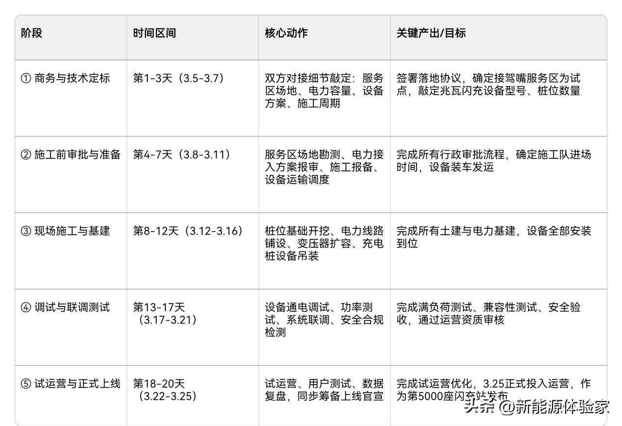比亚迪闪充高速服务区,从洽谈到上线只需20天! 从2026年3月5日双方座谈对接,到3月25日第5000座闪充站(甘肃兰州青兰高速接驾嘴服务区)正式运营,实际周期约20天。 我们可以把这20天拆解为「5个关键阶段」,按天还原推进节奏: Day 1-3(3.5-3.7):谈定“生死线” 核心是敲定「场地、电力、周期」三大关键条件。高服集团作为业主方,需要快速协调服务区场地、电力容量;比亚迪侧同步敲定设备型号、施工方案,3天内完成商务与技术的闭环,为后续抢工争取时间。 ​ Day 4-7(3.8-3.11):打通“审批关” 服务区施工需要路政、电力、消防等多部门审批,这是传统基建项目最耗时的环节。比亚迪通过标准化的高速站方案,配合高服集团的属地资源,4天内完成所有报备流程,实现“即批即开工”。 ​ Day 8-12(3.12-3.16):抢建“硬基建” 现场施工是最考验效率的环节:基础开挖、电缆铺设、变压器扩容、设备吊装同步推进,每天24小时轮班施工,5天内完成所有土建与安装,把“不可能完成的施工周期”压缩到极限。 ​ Day 13-17(3.17-3.21):通过“验收线” 兆瓦闪充设备需要通过满功率测试、兼容性测试、消防与电力验收,同时接入比亚迪闪充平台系统。这一阶段5天内完成所有测试与整改,拿到运营资质。 ​ Day 18-20(3.22-3.25):上线“里程碑” 试运营3天,完成用户侧的稳定性验证,3.25正式投入运营,实现“20天从对接落地”的行业奇迹。