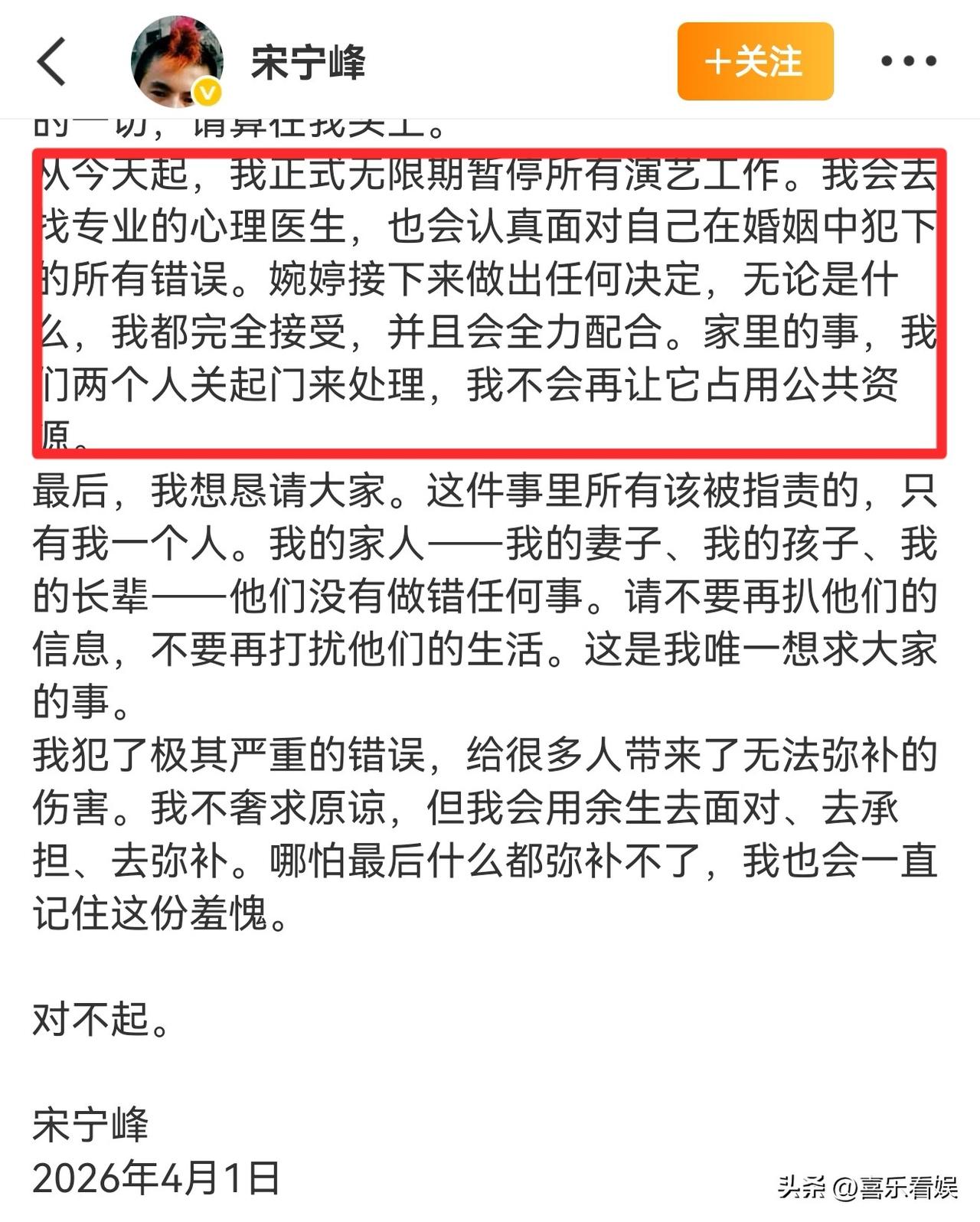 最后宋宁峰说,从今天起无限期暂停所有演艺工作,去看专业的心理医生,婉婷之后做什么决定他都全盘接受,也求大家别再扒他家人的信息,别打扰他们的生活,所有错都在他一个人。