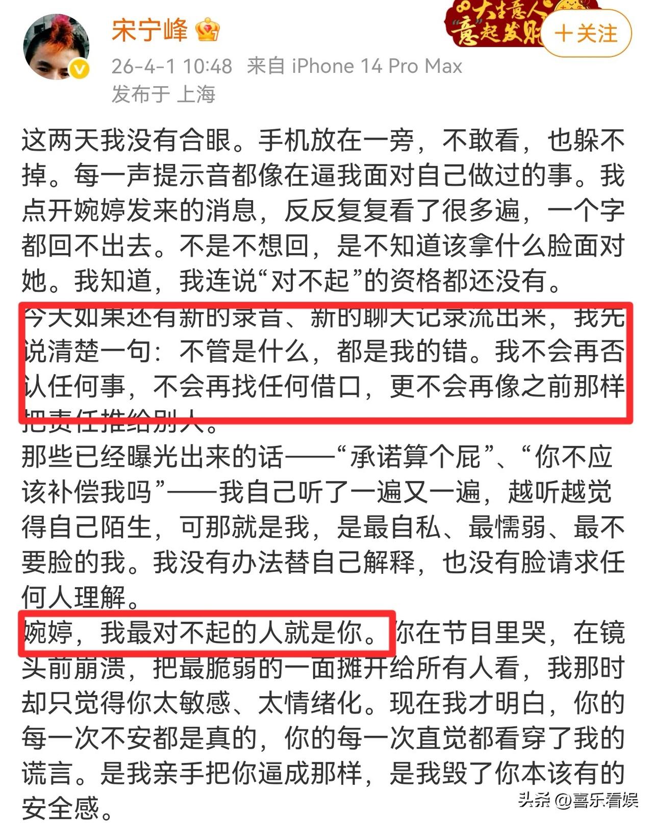 4月1日上午,宋宁峰终于发了长文,回应闹得沸沸扬扬的出轨事儿了。