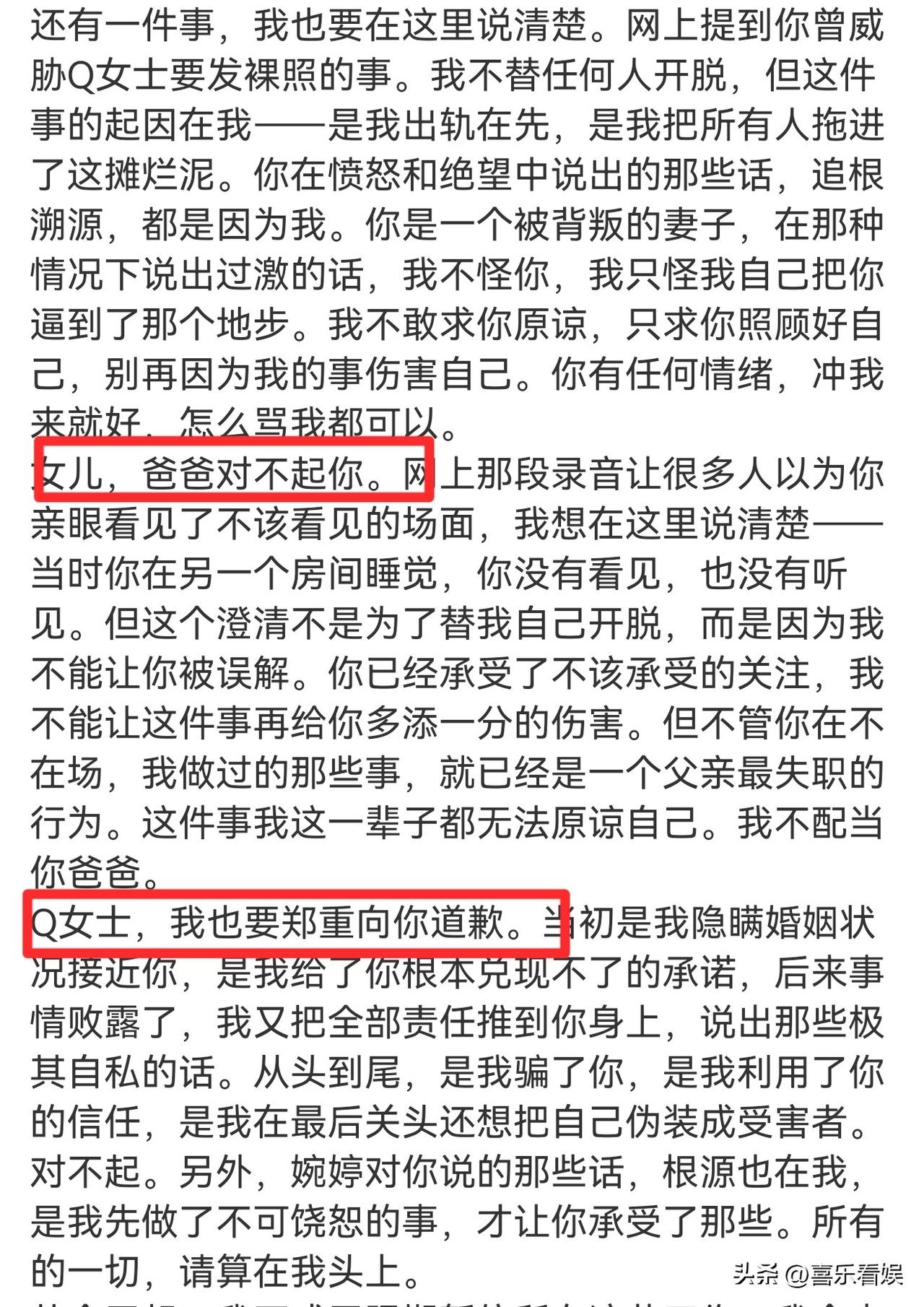 说实话,看他这篇长文,态度倒是摆得挺低,也认了所有错,但错已经犯了,给婉婷、给孩子、给Q女士造成的伤害,哪是一篇道歉文就能抹平的?