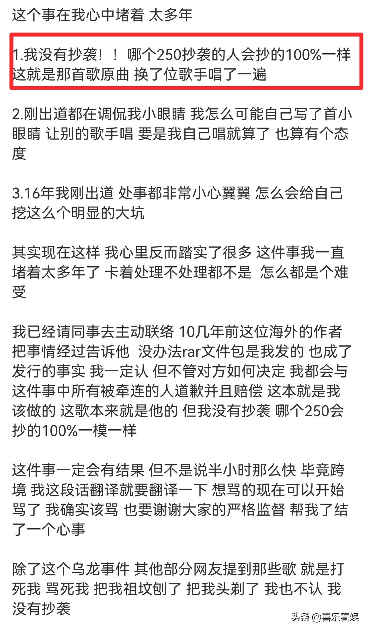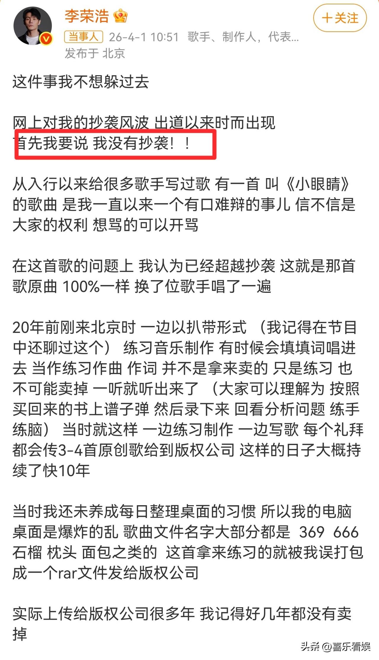 他上来就直接把话撂死:“我没有抄袭!”还特别刚地补了一句,这首歌就是原曲100%一模一样,换了个歌手唱了一遍,真要抄袭,谁会抄得完全没差?这不纯纯给自己找骂吗?