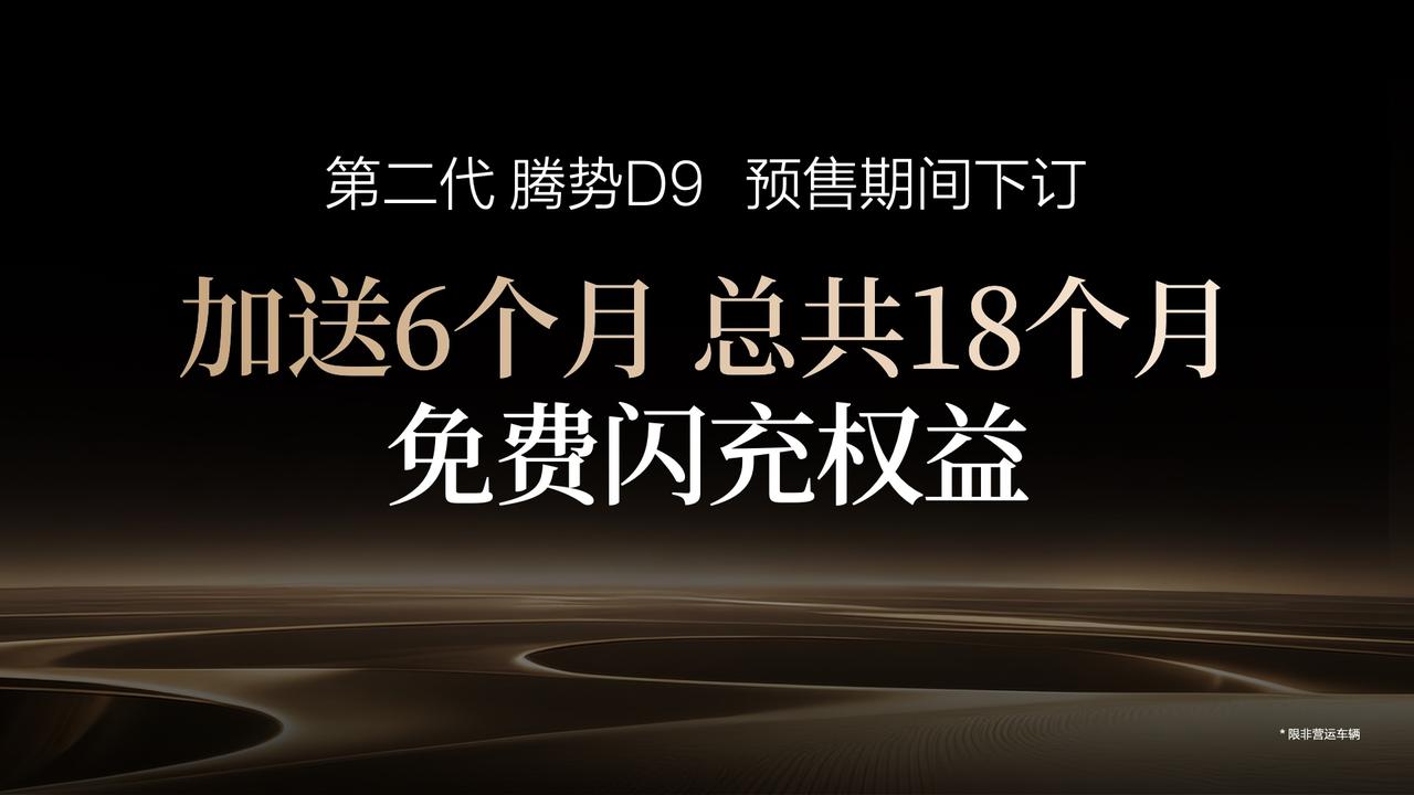第二代腾势D9预售价格区间为38.98万-48.98万。即日起下订,在1年免费闪充的基础上,再额外赠送6个月的免费闪充权益,总共18个月的免费闪充权益,让每一次出发都更从容!