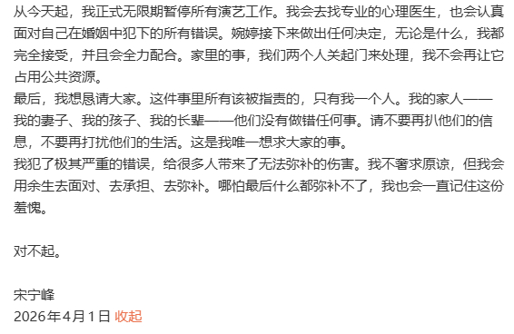【宋宁峰正式无限期暂停所有演艺工作】 长文回应近日风波,表示:“从今天起,我正式无限期暂停所有演艺工作。” 宋宁峰回应婚内出轨