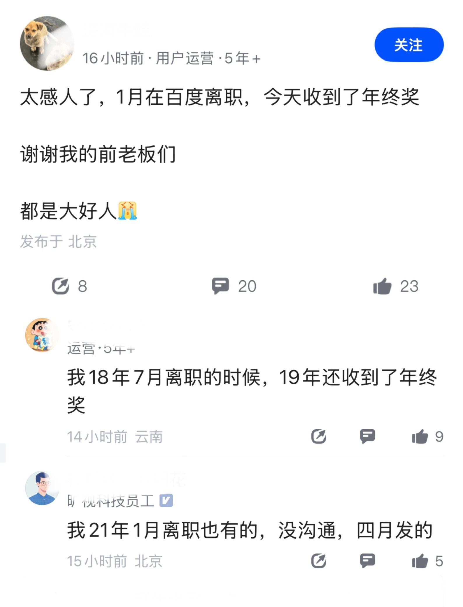 百度也这么卷,给离职员工发年终奖,这让其他不发的企业怎么想?一网友分享,“太感人