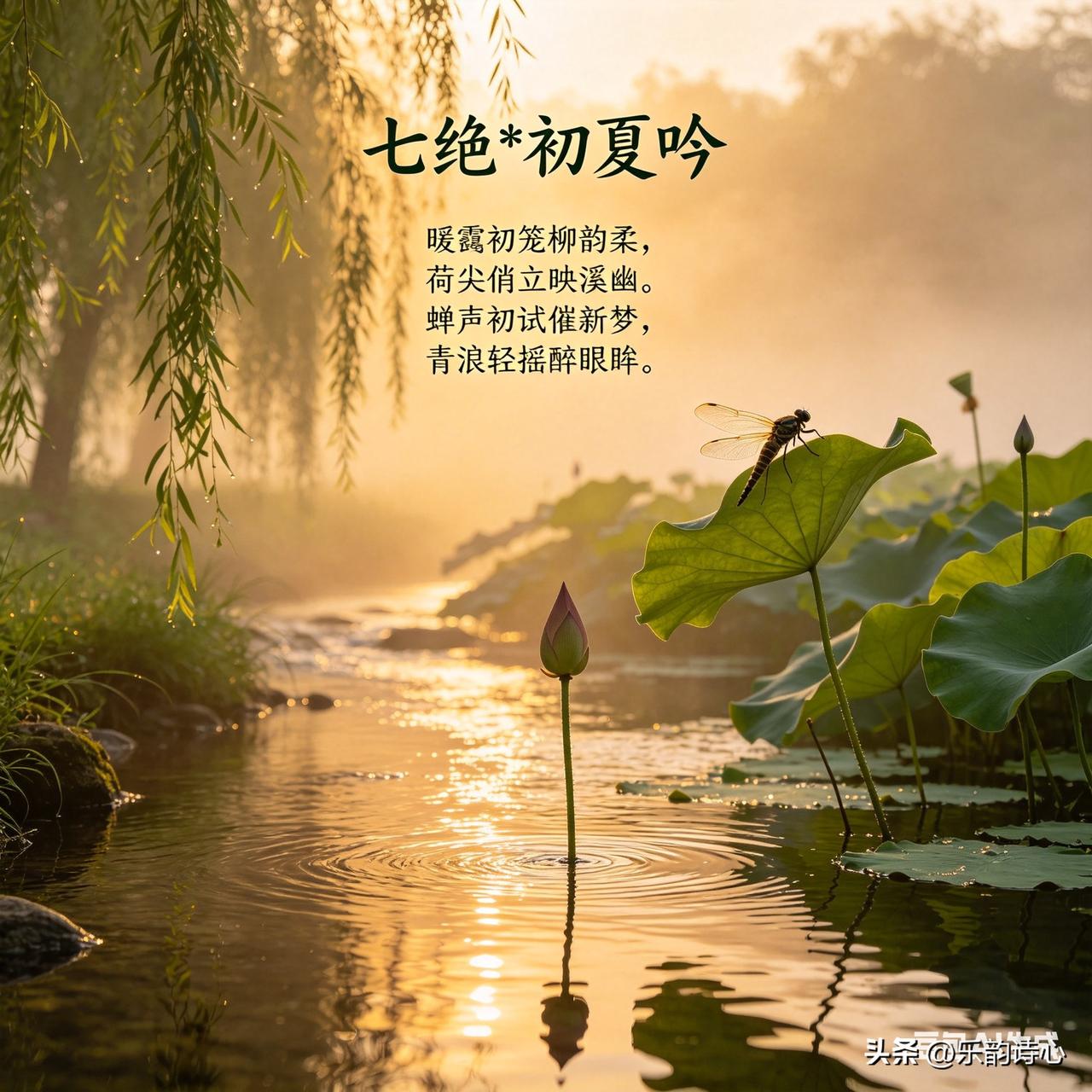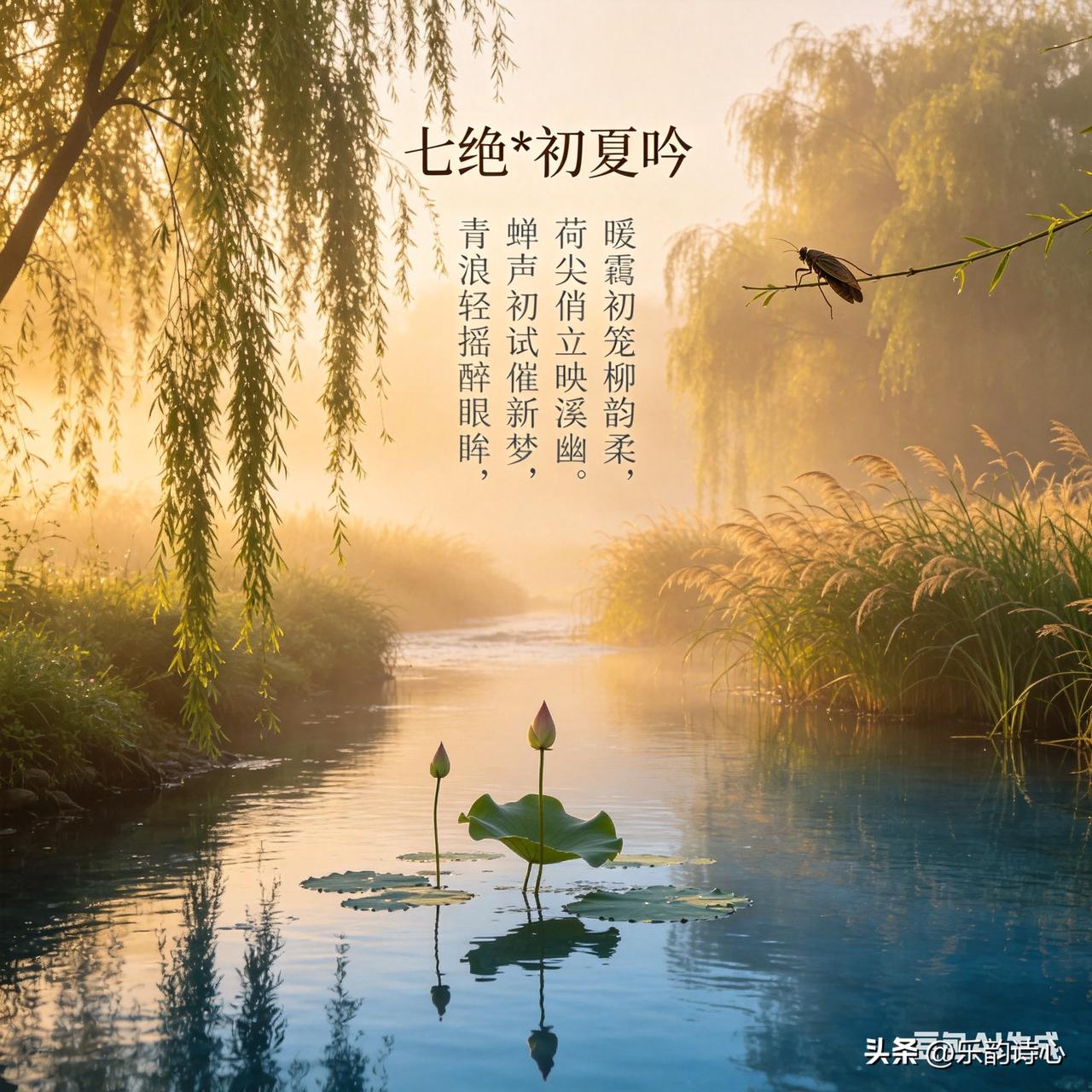 此首《七绝·初夏吟》,开篇“暖霭初笼柳韵柔”,以暖霭轻笼营造朦胧氛围,凸显柳树柔美韵致。次句“荷尖俏立映溪幽”,将荷尖拟人化,尽显俏皮,与幽静溪水相映成趣。三句“蝉声初试催新梦”,赋予蝉声新奇灵动之感,暗喻生机萌动。尾句“麦浪轻摇醉眼眸”,展现田园之美,令人陶醉。