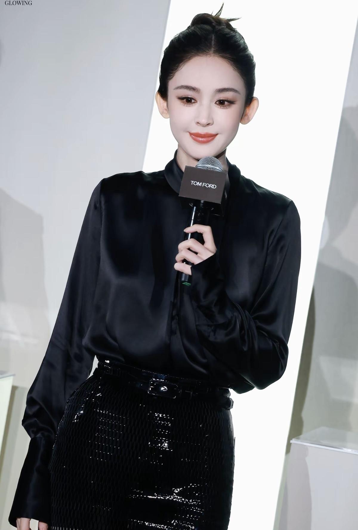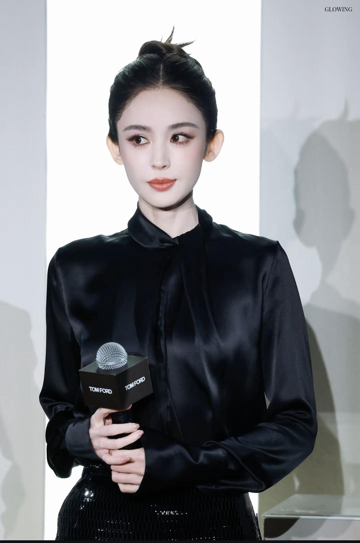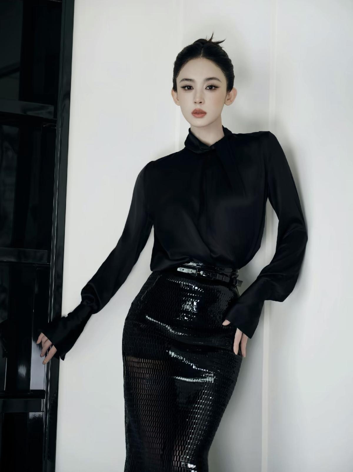古力娜扎身着Tom Ford黑色缎面衬衫与亮片半裙[赞]高丸子头搭配明艳红唇,将