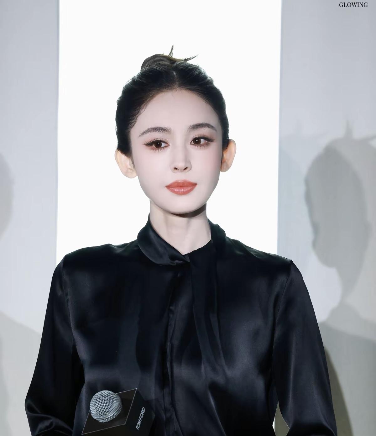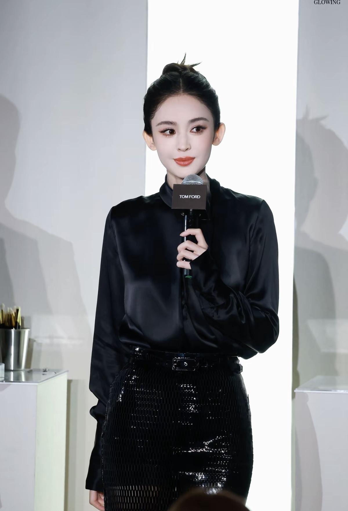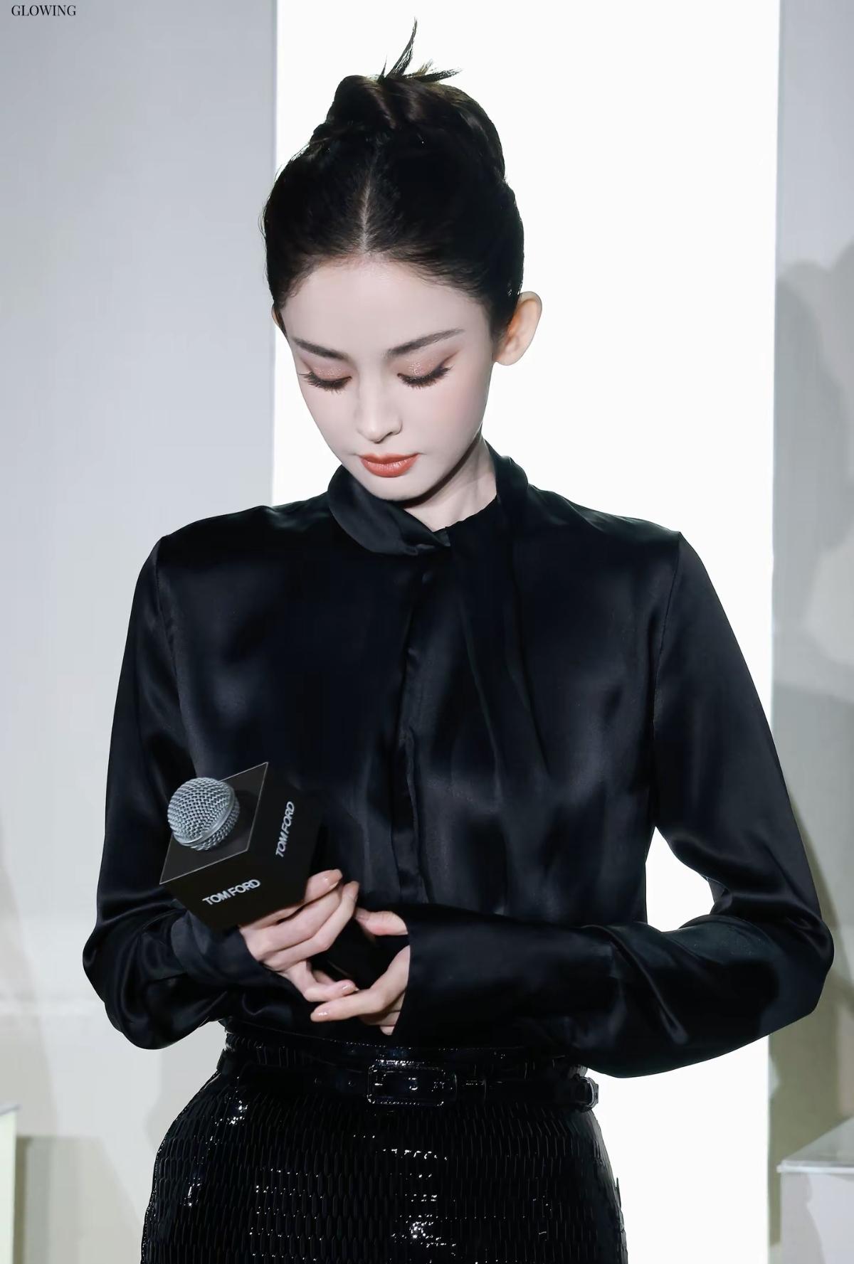 古力娜扎身着Tom Ford黑色缎面衬衫与亮片半裙[赞]高丸子头搭配明艳红唇,将