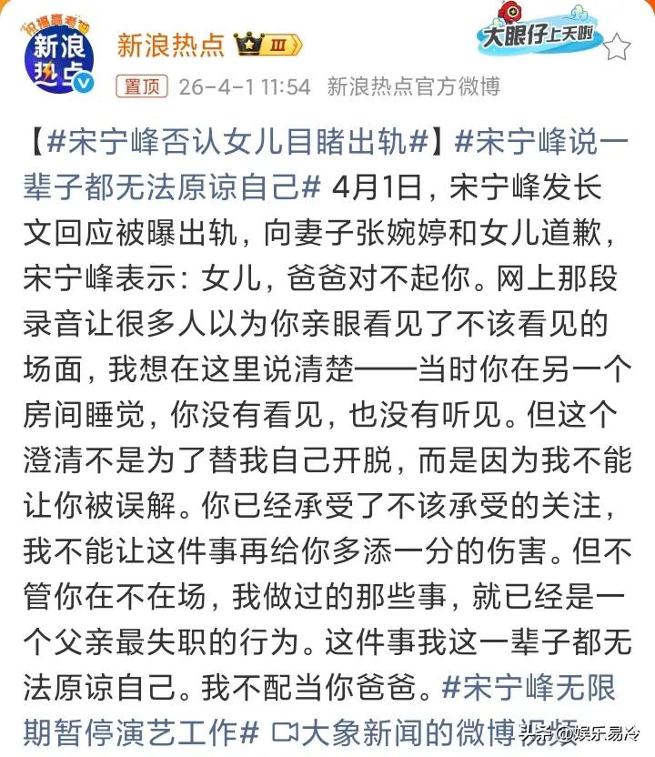 宋宁峰承认带着女儿出轨,但否认女儿亲眼目睹出轨;他不怪妻子张婉婷威胁Q女士发她的粿照,因为他认为一切都是因为自己把张婉婷逼到了那个地步;他承认隐瞒婚姻状况是对不起Q女士,但请Q女士不要怪张婉婷;你认可宋宁峰的道歉吗?