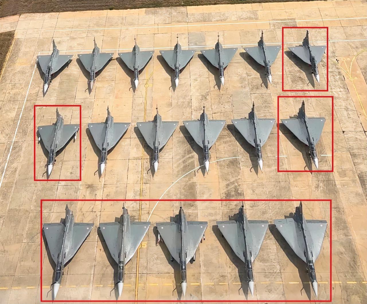 印度又整活了,光辉战机交付玩出了新花样,印度斯坦航空公司一次性向外界展出了20架新生产的LCAMK1A“光辉”战斗机,“准备”交付印度空军。反正还在准备中,至于什么时候能交付,没人敢保证。 这一批次交付的新机,上面的18架光辉只有8架装了美制F404发动机,装发动机的我用红框圈起来了,其余10架飞机屁股是空的。 至于最下面2架黄皮的,左边那架也是没有发动机的,右边那架由于拍摄角度很刁钻不好判断,飞机尾巴只露出来一点点,感觉应该这架装了,毕竟在最前面,哪能2架都不装发动机啊。