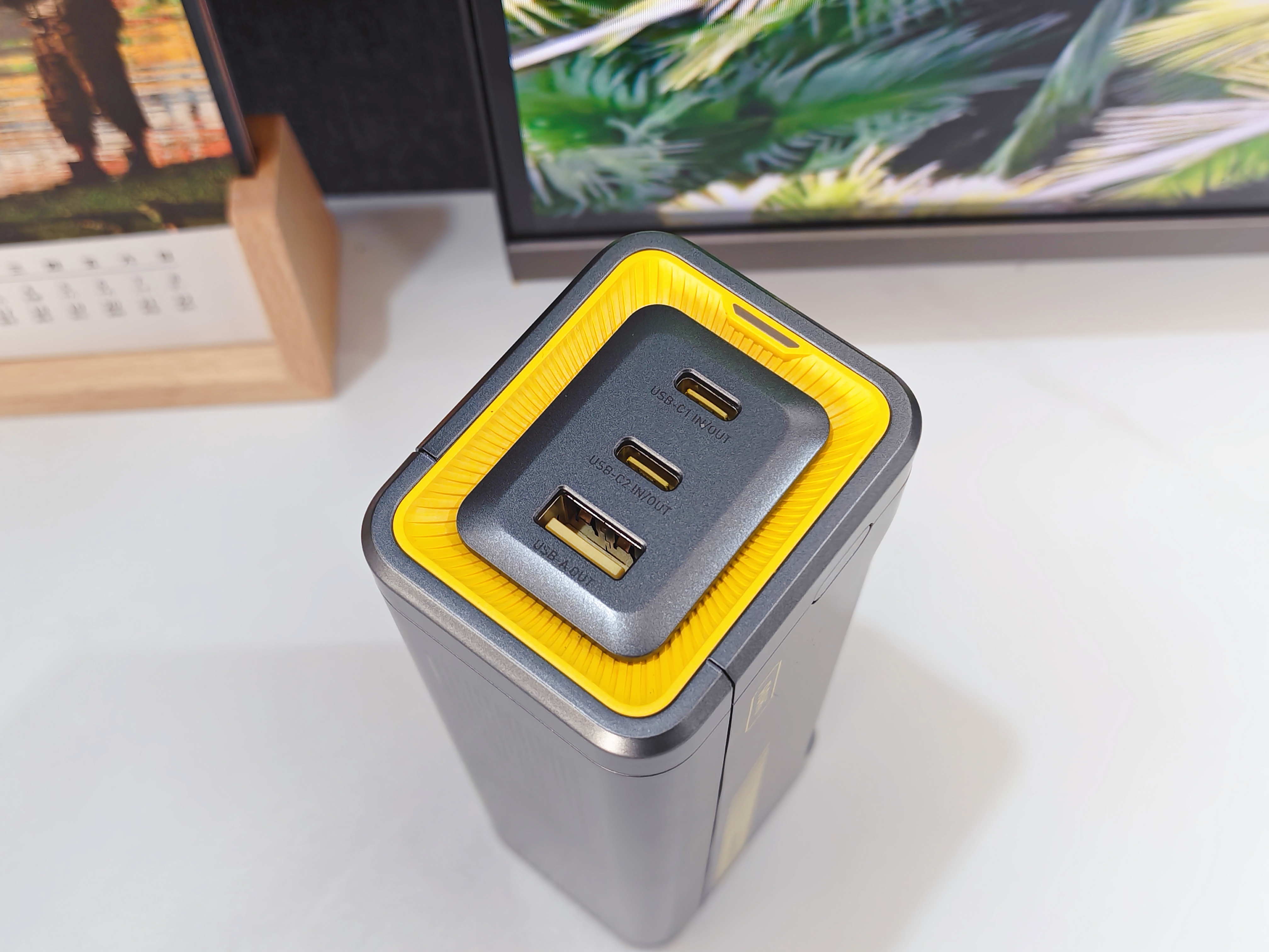 开箱那一套黑黄配色还是老味道,机身半透磨砂,屏幕嵌在里面像个小仪表盘。顶部俩C口一个A口,指示灯呼吸闪烁的时候,确实有点“星舰”那个意思。