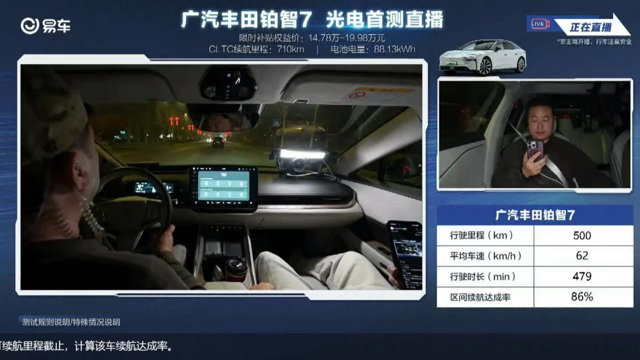 测试用的是铂智7的710 Ultra激光雷达版,全程3人满载带设备,开着24℃的自动空调,路线一路从杭州到连云港,既覆盖了城区日常通勤,也包含了长途出行的高速工况,很贴合用户日常的用车情况了很多车型只能在理想环境下跑出高达成率,而到了满载车况,座舱内部开着空调,天气也不好的日常场景下,续航就容易对半砍。而铂智7能在这种贴近日常的测试条件下,不管是城市通勤还是高速长途,都能把续航达成率和能耗控制在稳定水平,才是真的能看出这辆车有东西铂智7限时权益价14.78万起,全系车型在叠加权益后都在20万以内,还有600km、700km、710km多种续航配置可以选择,真香真靠谱丰田铂智7全网首次直播测试