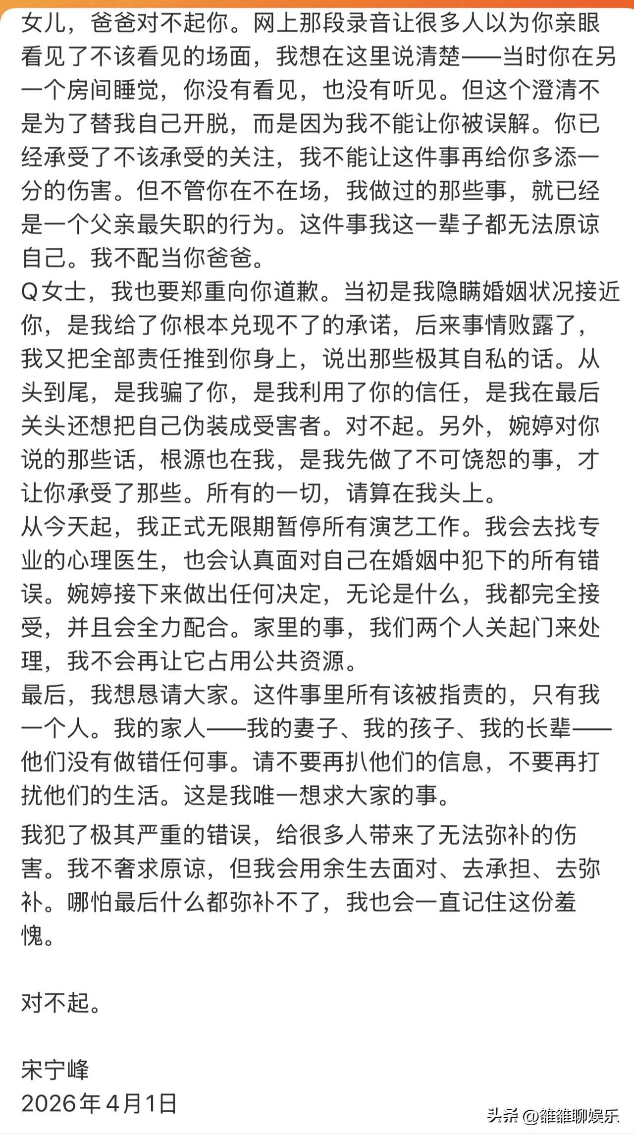 宋宁峰,发文回应出轨。 4月1日,宋宁峰在社交平台发布千字长文,回应最近的出轨争议,言辞“诚恳”,毫无辩解,并宣布彻底退圈,他的回应撕开了婚姻的遮羞布,引发无数网友热议。 长文中,宋宁峰承认自己出轨事实,他坦言不管是录音,还是聊天记录,或者接下来可能爆出的其他证据,他都全盘接受。 他承认自己自私懦弱,还有那些录音中不堪的话,伤害了张婉婷和Q女士,他亲手把妻子逼成了现在这个样子,全都是自己的错,他也对Q女士郑重道歉,是自己隐瞒婚姻状况,欺骗了她,还把责任推给她,这一切都是自己的错。 她还特意强调了,关于“女儿在场”恶的争议,他澄清,当时女儿是在另一个房间睡觉。并没有看见也没有听见现场发生的任何事,他不希望女儿被误,愧对于女儿。 从今天起,自己无限期暂停所有演艺工作,接受心理医生治疗,直面自己犯的错,张婉婷想做任何决定他都配合。 看完他的发文,网友唏嘘不已,他虽然承认了自己的错误,但对两个女人和孩子的伤害,已经无法弥补,婚姻的底线是忠诚,一旦打破就再也没有信任。 从这场风波被爆出来,就意味着宋宁峰要退圈了,张婉婷早就知道他出轨,为了不影响他的事业,一直帮他隐瞒,毕竟养孩子需要钱,但偏偏Q女士也想要钱,宋宁峰不给钱不负责,Q女士只好让他身败名裂了。 娱乐圈从不缺塌房的艺人,每一次塌房都在消耗着观众的艺人,外表看似老实的人,却做着伤天害理的事。
