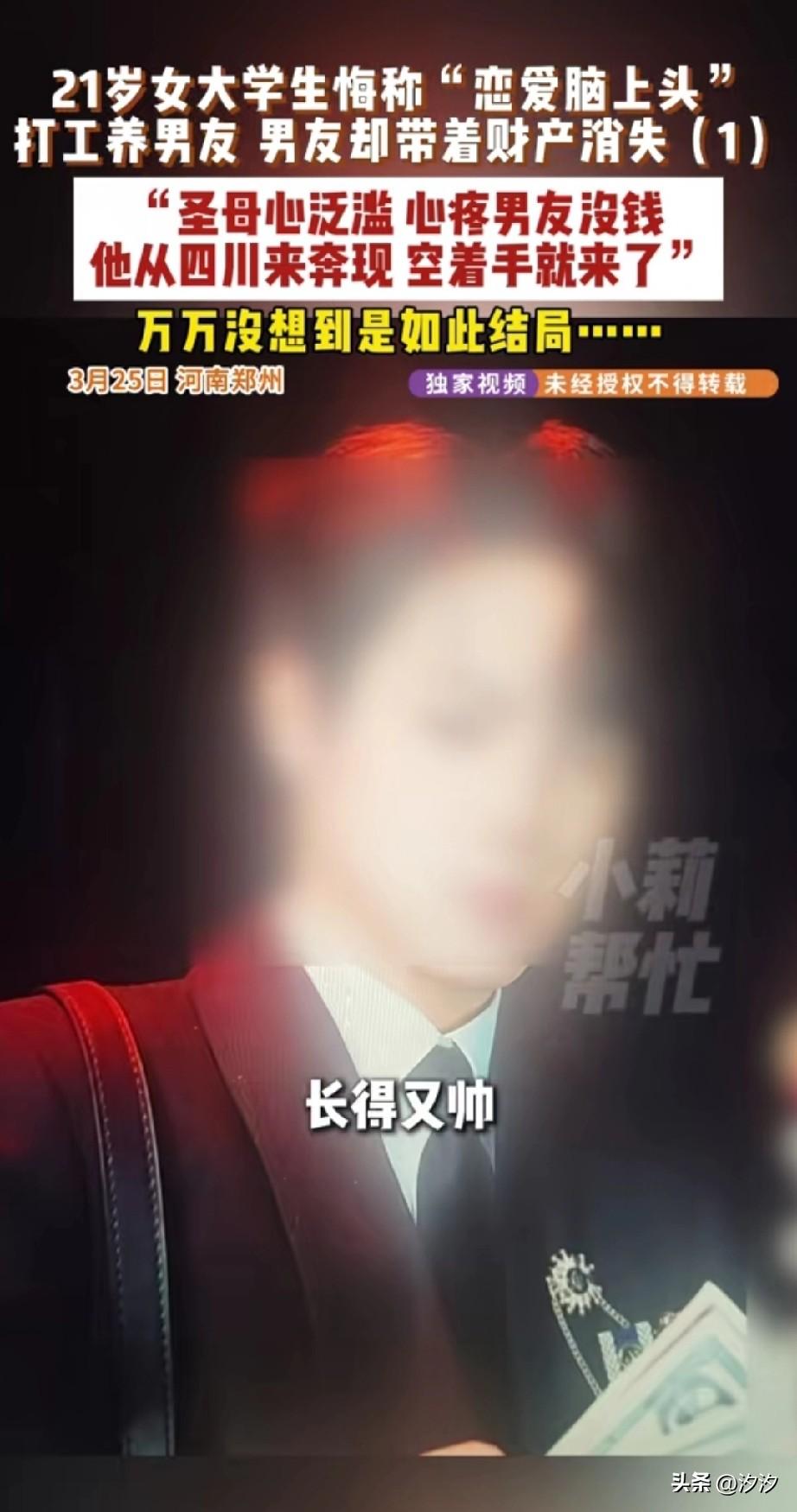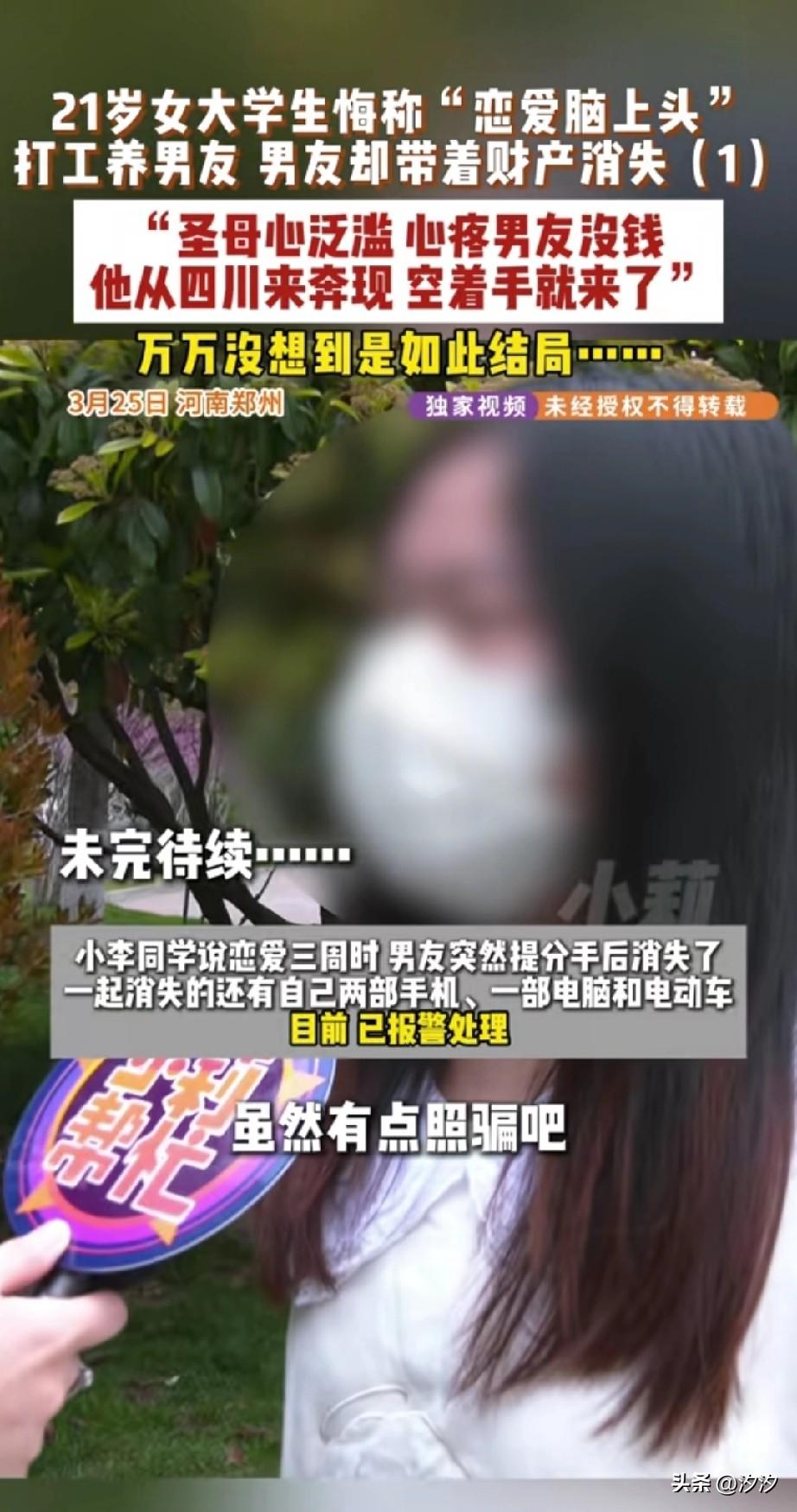 21岁郑州女大学生, 打游戏前认识了一个四川网友, 两个人聊的非常投机, 就看到对方的照片,长得太帅了, 于是就喊对方过来奔现, 看到本人之后虽然没有照片,帅, 但还是很快确立了男女关系, 对方来的时候什么都没有买, 就是空着手来的, 还没有钱吃饭,住宿, 女大学生恋爱脑上头, 给自己的男友转钱,养男友, 没想到恋爱三周后, 她的这名男友直接玩起了消失, 和男友一起消失的,还有他的一台电脑,两台手机和她的电动车, 现在后悔的都想扇自己两耳光, 目前已经报给了叔叔, 希望找到这个男友, 女生恋爱脑上头真的很可怕, 大家见过这样有恋爱脑的女生吗? 一起聊聊爱情 郑州情侣分手