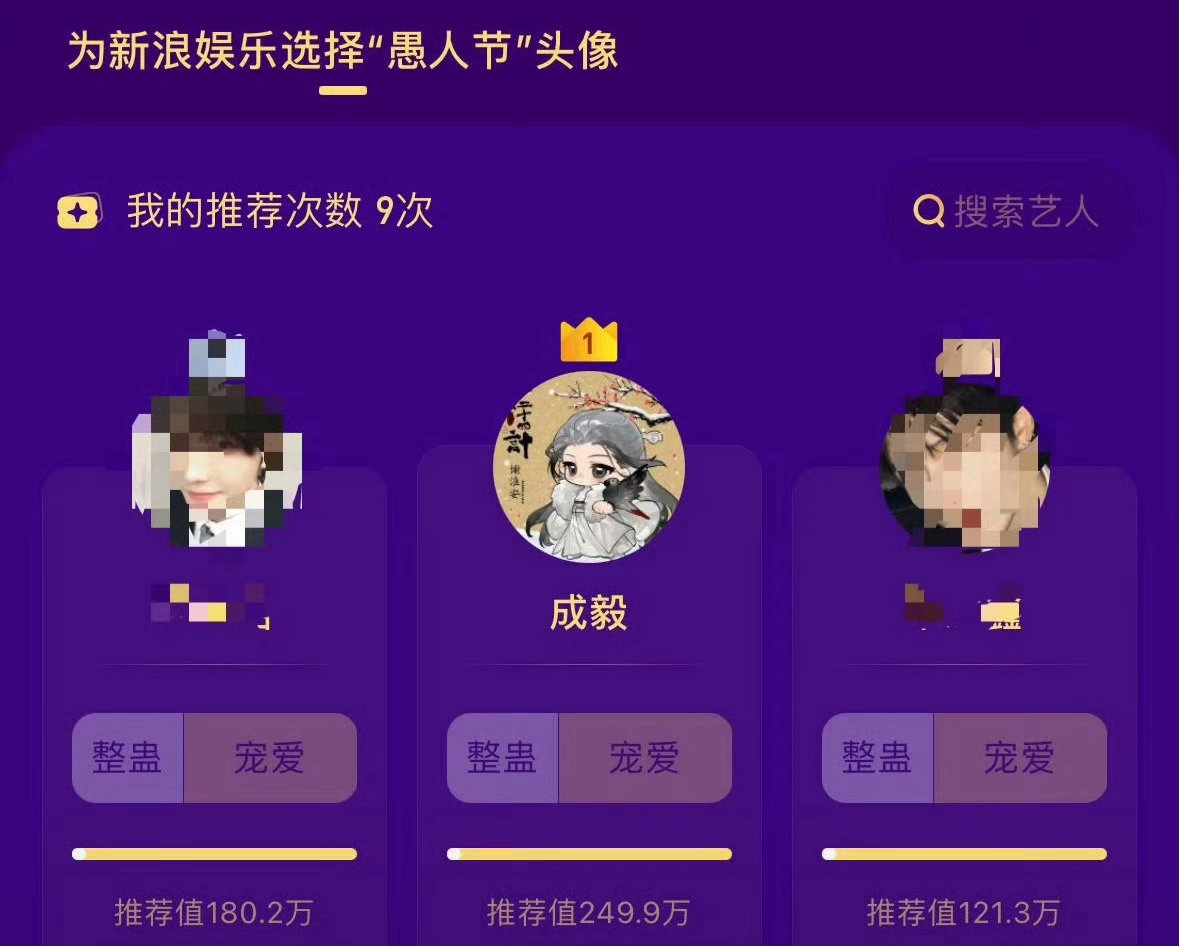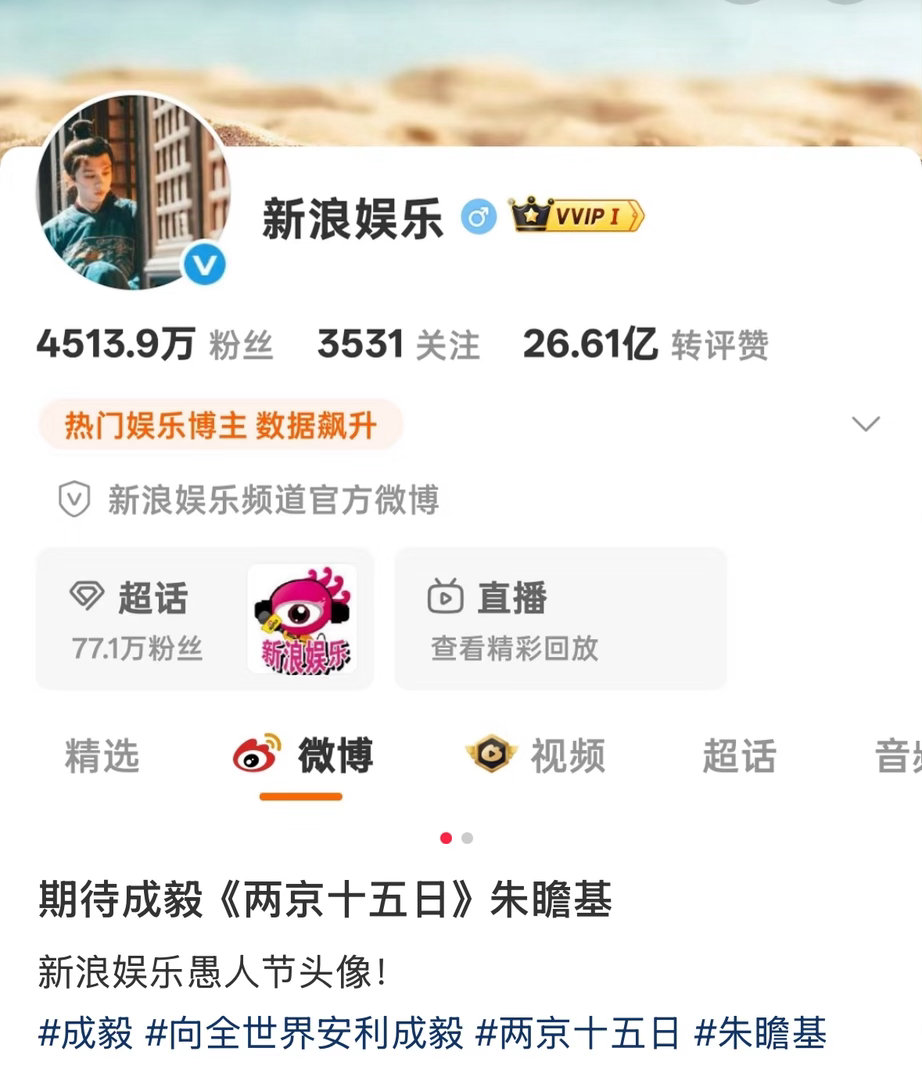 官方账号“新浪娱乐”作为头部媒体平台,选择在愚人节当天,将其官方头像换成成毅饰演