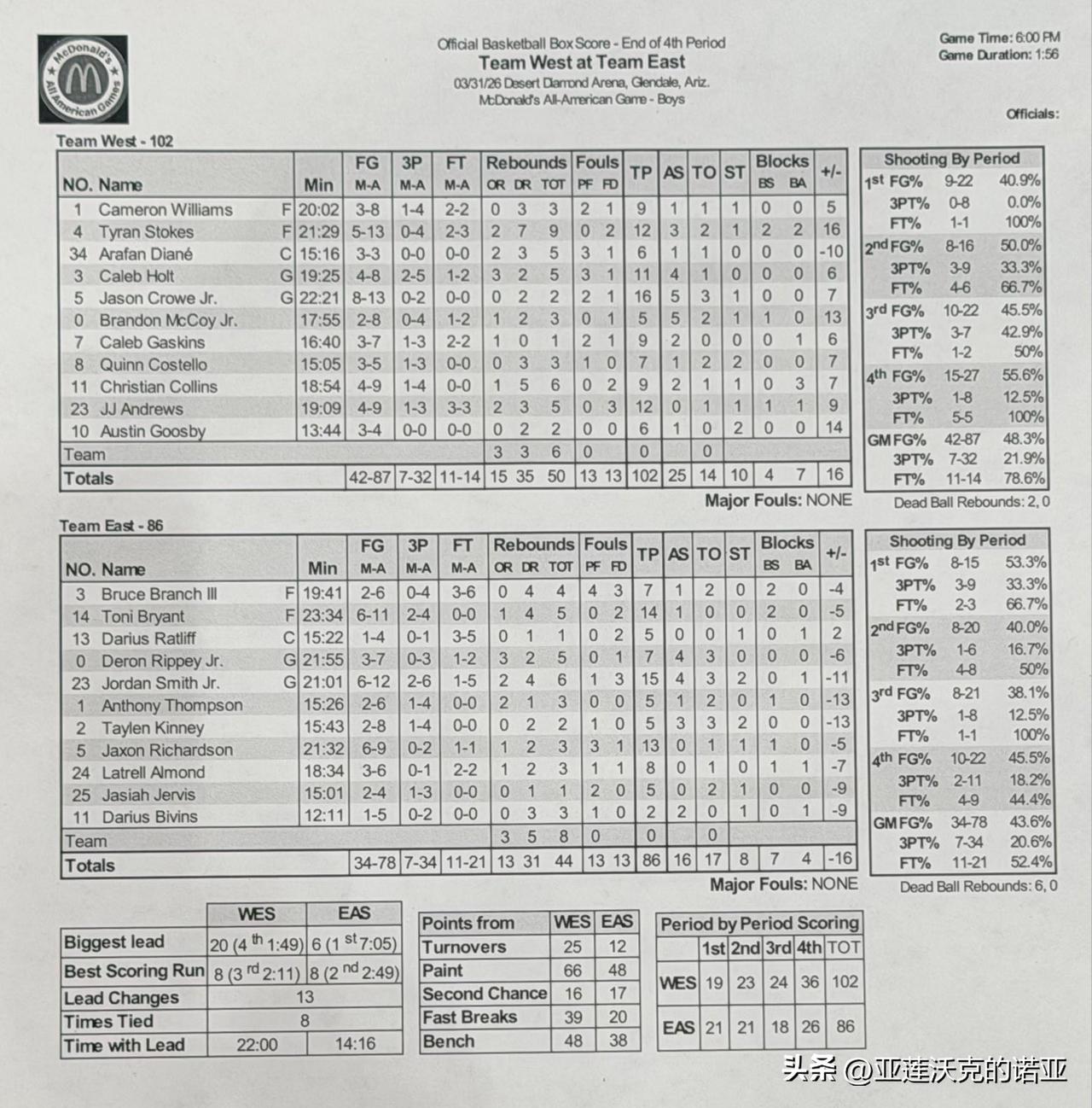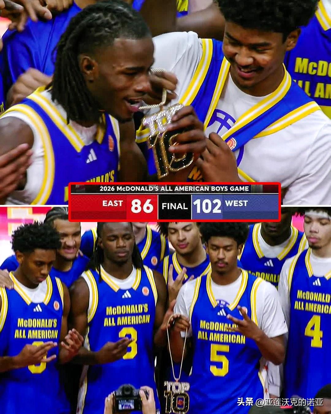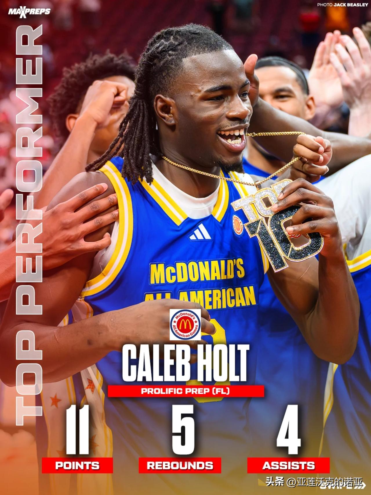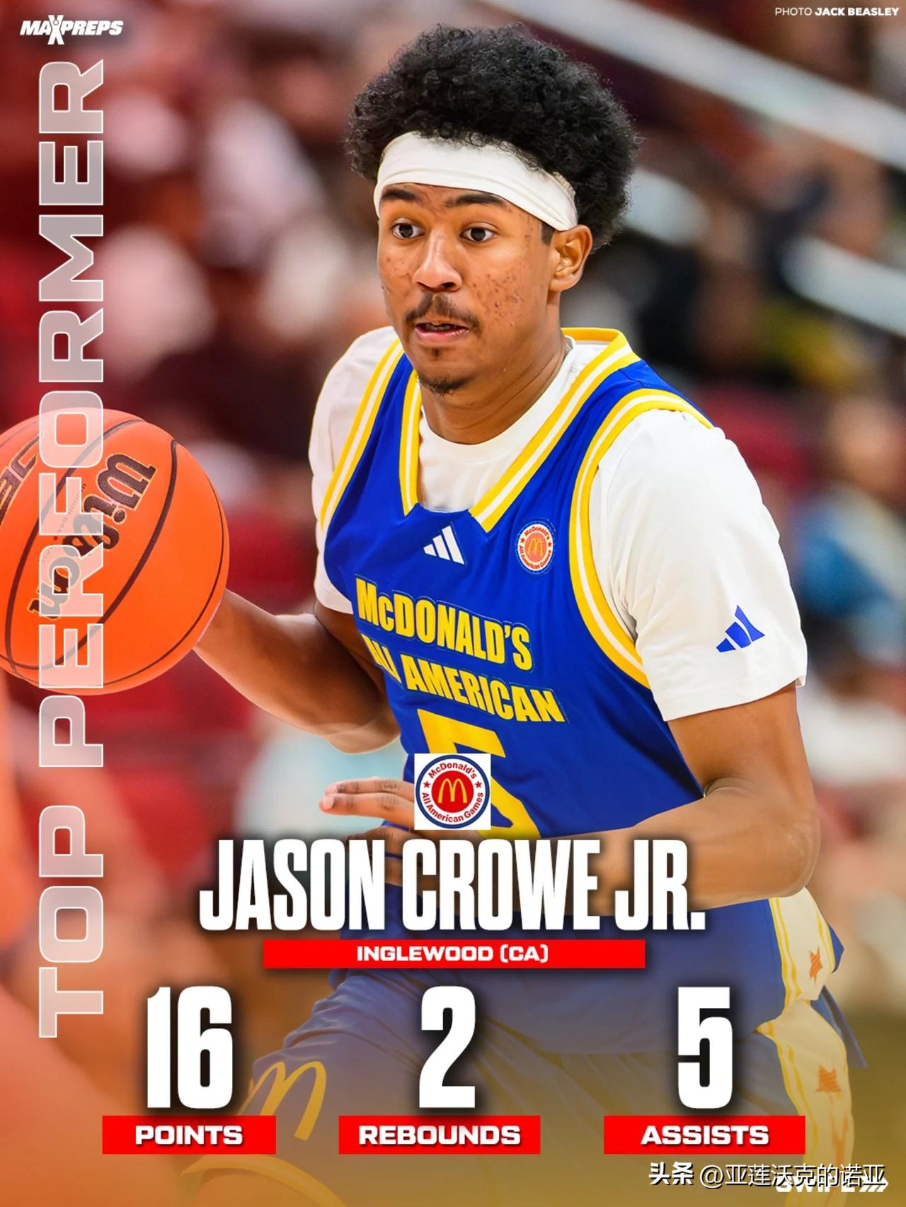 密苏里Jason Crowe Jr单场16分5助攻2篮板,亚利桑那Caleb Holt得到11分5篮板4助攻,帮助西部以102比86击败东部,两人共享了麦当劳全明星赛MVP,球探Nathan Grubel表示他目前倾向于把Jordan Smith Jr排在2027年nba选秀 状元的位置,他是个狠角色,攻防两端都极具爆发力。