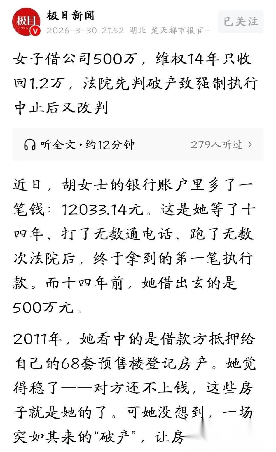 太讽刺了!黑龙江大庆,女子一时冲动,将全家的500万血汗钱借给某房地产公司,对方承诺四个月就还,给20万利息,要是拿不出现金,大批在建房源就直接拿去兜底。 账当初算得挺美,结果却是血本无归。 这官司一打就是整整十四年。 老姐四处奔波,好不容易赢了诉讼。本以为手里握着法院裁准的优选项,这笔巨额家财总算能落袋为安。 谁知开发商在这时候玩了手阴的。 欠债企业内部居然有人跳出来,主动申请破产清算。等这一大套繁琐冗长的司法程序走完,那些早就办过抵押备案的房子,人家背地里全给悄悄卖光了。 千万级别的身家砸进去,最后退到她手里的,只有可怜的一万两千多块钱。 这位老姐当初犯了个致命错:太迷信那些看得见的死物抵押,却低估了生意场上的狠毒。 她满脑子盘算的,是四个月赚二十万的静态死利息。人家开发商玩的,却是“左手倒右手”的资产隔离。老百姓拿毕生积蓄去跟这帮老油条对赌,哪来的公平?纯粹是赤裸裸的收割。 一家连执照早就作废的空壳公司,居然还能大肆圈钱。随便造出几笔糊涂账,就能堂而皇之地走合法通道逃避债务。 普通老百姓那点朴素认知,根本防不住这种漏洞百出的脱壳诡计。这套做局手法,跟十几年前坑害过无数家庭的P2P套路几乎一模一样。只要高薪回报的诱饵抛出来,后面必定埋伏着合法的深渊。 别拿活命的底线资金去赌别人的人性良知。 在复杂的商业算计里,外行以为坚如磐石的筹码,到了内行眼中,不过是随时能扔的破烂。 你拼尽全力去贪人家那点暴利分红,别人从开局的第一秒起,锁定的就是你碗底剩下的最后一点口粮。 对此,你怎么看?
