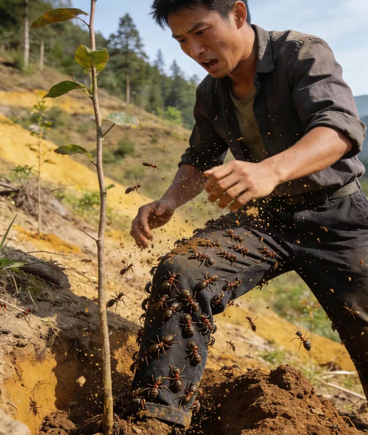 周末本想上山给绿化做点贡献,男子正吭哧吭哧挖坑,一铲子下去,手感突然变得软绵绵的。还没等他回过神,土里“轰”地一下,黑压压的蚂蚁大军瞬间炸锅,密密麻麻地朝他扑来。