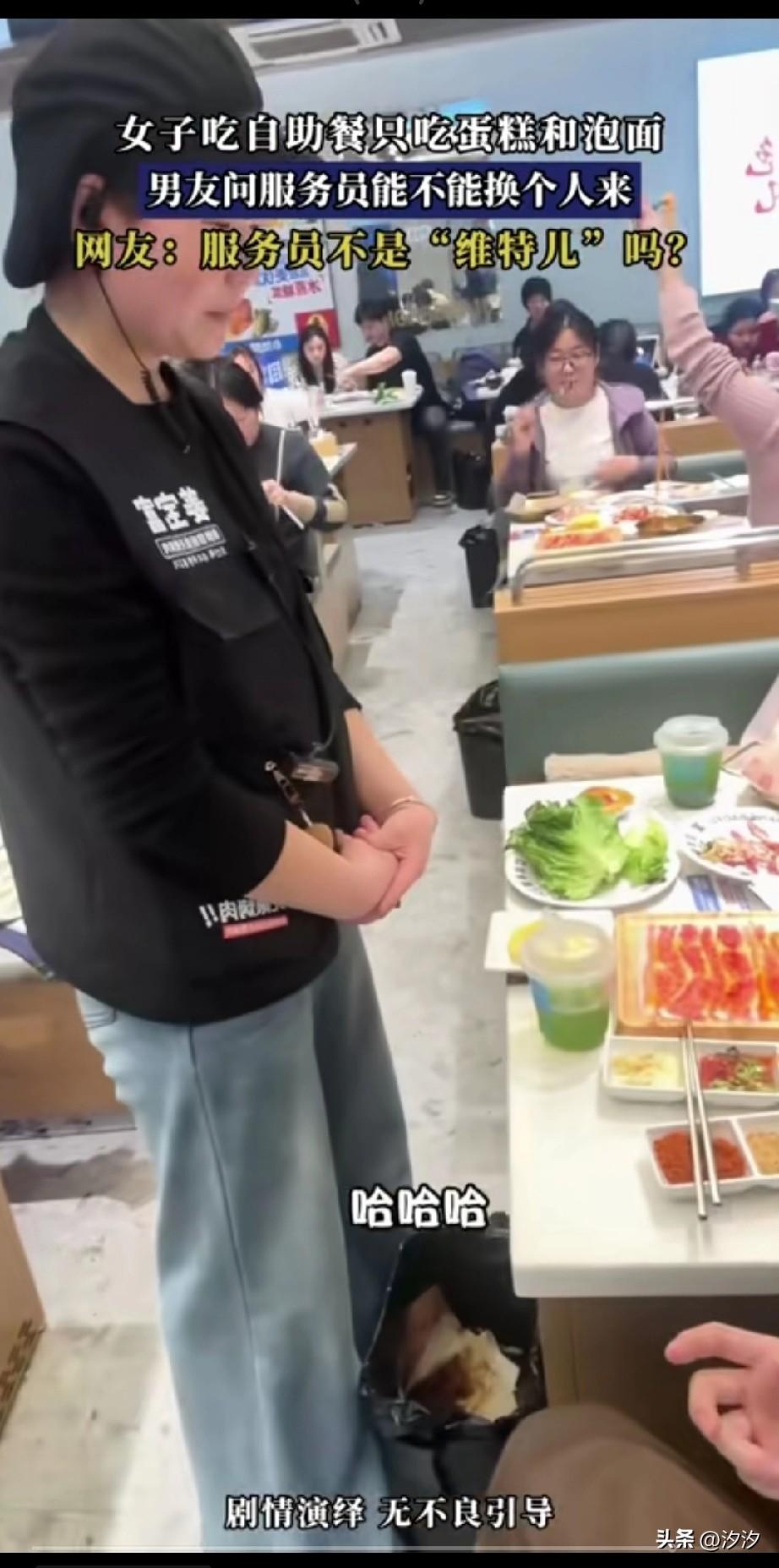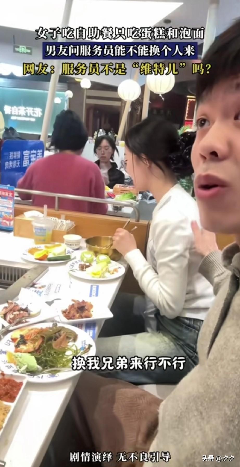 男子带着自己的女友去吃自助餐, 自己拿了好多的烤肉和各种蔬菜, 结果自己的女友只吃泡面和蛋糕, 这可把小伙子急坏了, 最后开玩笑的叫来了服务员, 由于太过激动,直接叫了mother, 直接把服务员都逗乐了, 他对服务员说, 自己的女朋友还没有开始吃, 我能不能找我兄弟过来? 和她换一换, 服务员看着很为难的样子, 肯定不能答应了, 有些女生本来就不适合吃自助, 她们只吃泡面和蛋糕, 想让女生吃回本, 那基本是不可能的, 不过话说回来, 吃自助的开心是吃自己喜欢吃的, 并不是一定要吃回本才罢休, 毕竟身体是自己的, 大家觉得对吗? 美食记 女朋友午餐 女生吃自助 带老婆吃牛排 带女友吃火锅 带对象去的餐厅 自助餐女孩