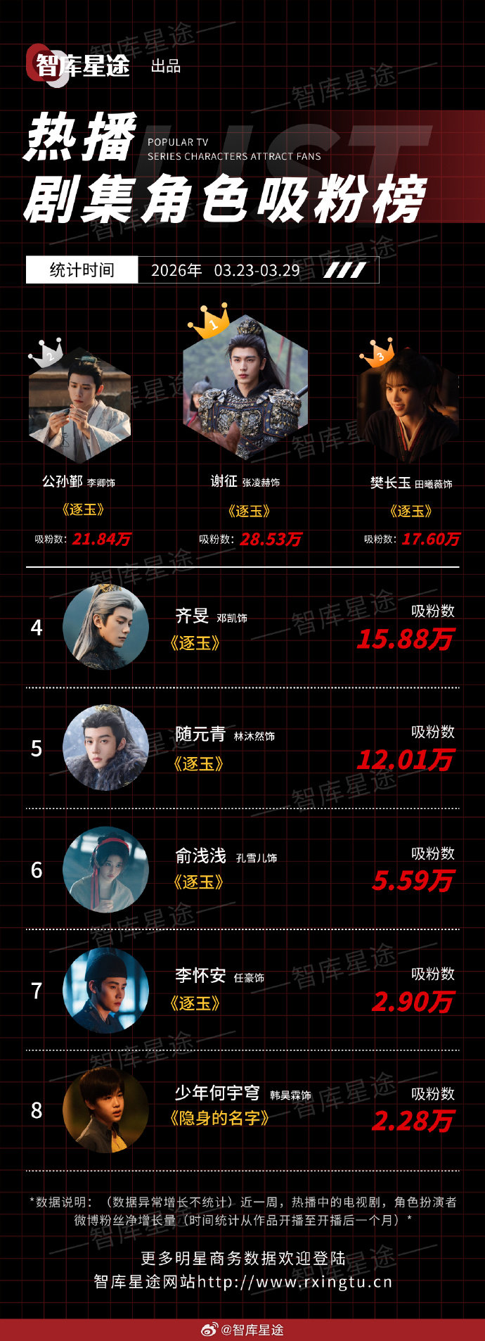 逐玉角色包揽吸粉榜前七张凌赫播剧角色吸粉榜第一《逐玉》角色包揽吸粉榜前七:1、张凌赫、谢征 2、李卿、公孙鄞3、田曦薇、樊长玉 4、邓凯、齐旻5、随元青、随元青6、孔雪儿 、俞浅浅7、任豪、李怀安 全员上桌,一个都没落下!