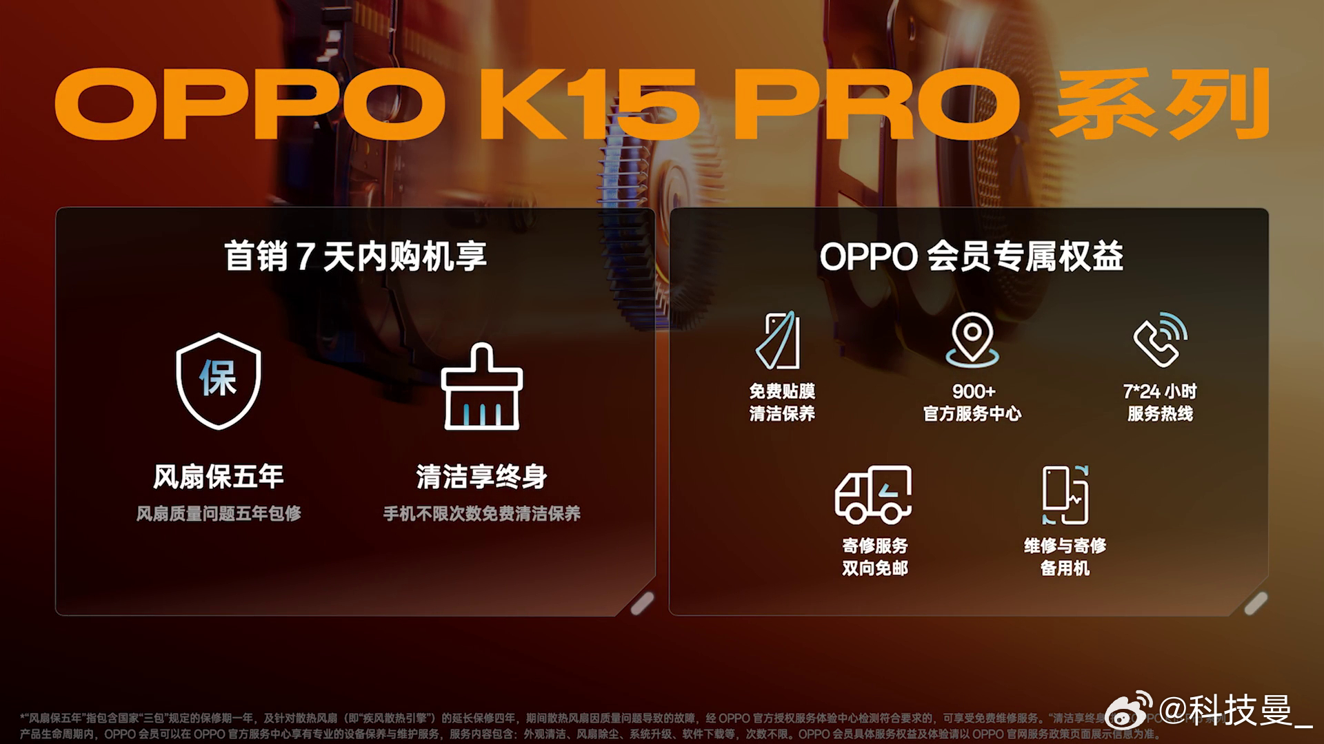 OPPO K15 Pro 系列 首销7天内购机即可免费享受行业最强手机5年风扇保,5年内风扇出现问题,整个部件直接只换不修,手机终身清洁保养权益。惊喜彩蛋,OPPO K15 Pro 系列与专注 Z 世代情绪表达的原创国潮服饰品牌CryingCenter 哭喊中心携手合作,以当下流行的街头涂鸦风格为创作灵感,推出了“泪仔与 K15 玩在一起”联名限量款卫衣和手机壳周边。4月3日起,上电商平台搜索 “ OPPO K15 Pro ”,进入 OPPO 官方直播间参与互动的用户,即有机会免费获得定制联名周边。数量有限,先到先得!