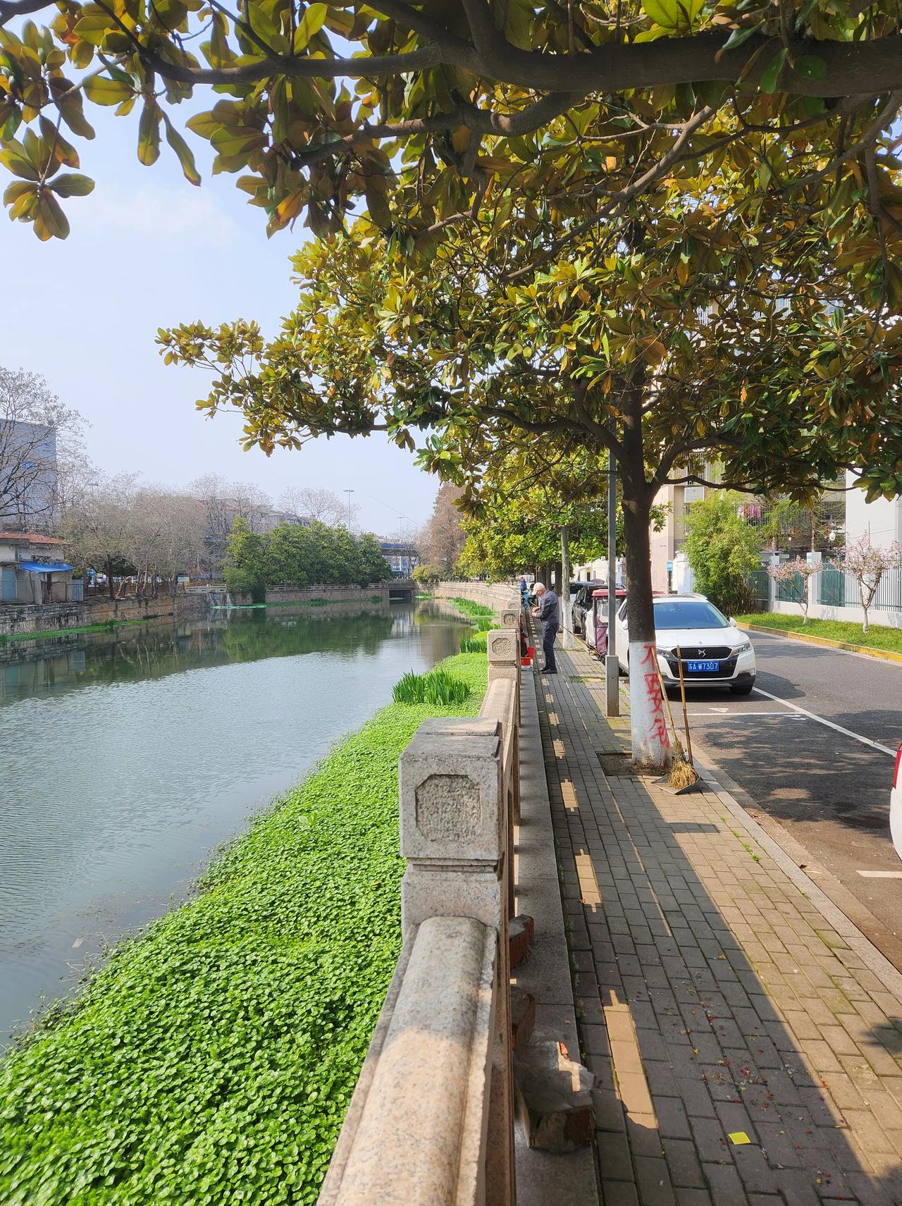 南京十二中不8边上的金川河边,很多钓鱼的人。但边上树上有人用红漆写上了禁止钓鱼,