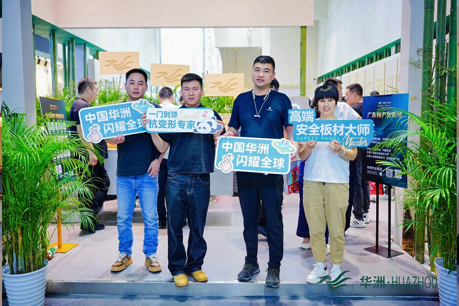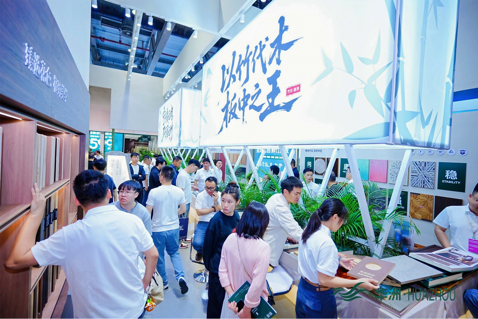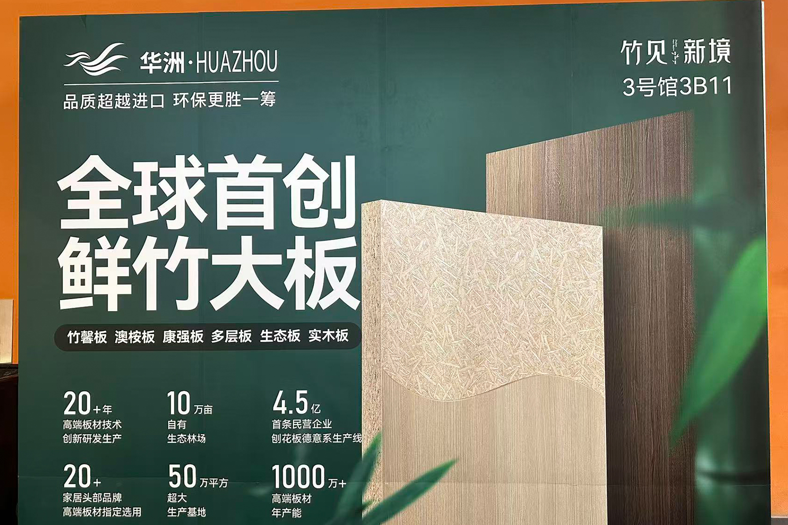 作为深耕板材领域28年的老牌企业,华洲木业此次参展精准贴合行业绿色环保、多元创新的发展导向,以“竹见新境”为核心主题,携全球首创竹馨板、金品澳桉板等七大核心系列惊艳亮相,将东方竹韵与现代家居科技完美融合,为现场观众带来了一场沉浸式的绿色家居体验。展厅设计巧妙融入原竹、竹制品、竹文化等东方元素,搭配天然鲜竹大板,让来访者在近距离感受产品质感的同时,深刻体会“以竹代木”的生态魅力,传递出品牌践行绿色低碳发展的坚定理念。