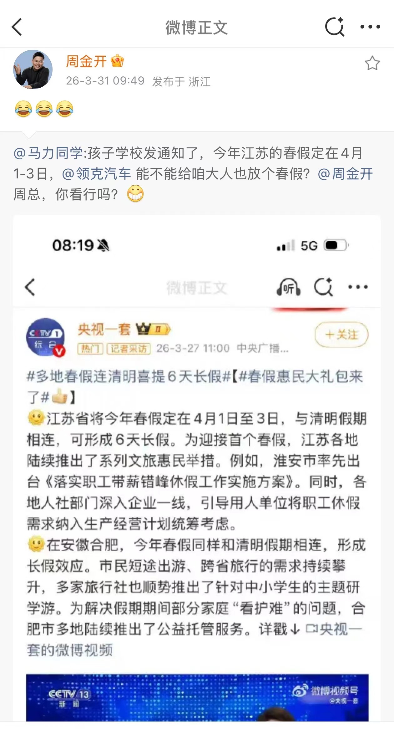 这波车企的春假福利,真是一个接一个,看得人眼热。浙江一车企落实一线错峰休假制度继奇瑞给一线职工安排带薪春假之后,领克也跟上了,4月1日全国销售一线放一天假,不调休、不减薪、不占年假,给的是实打实的体谅。说实话,销售一线有多拼大家都知道,月底冲业绩、电话打到嗓子哑,这时候能有人拍板说:歇一天,去陪家人,比什么鸡汤都管用。带薪春假从纸面权利到现实福利