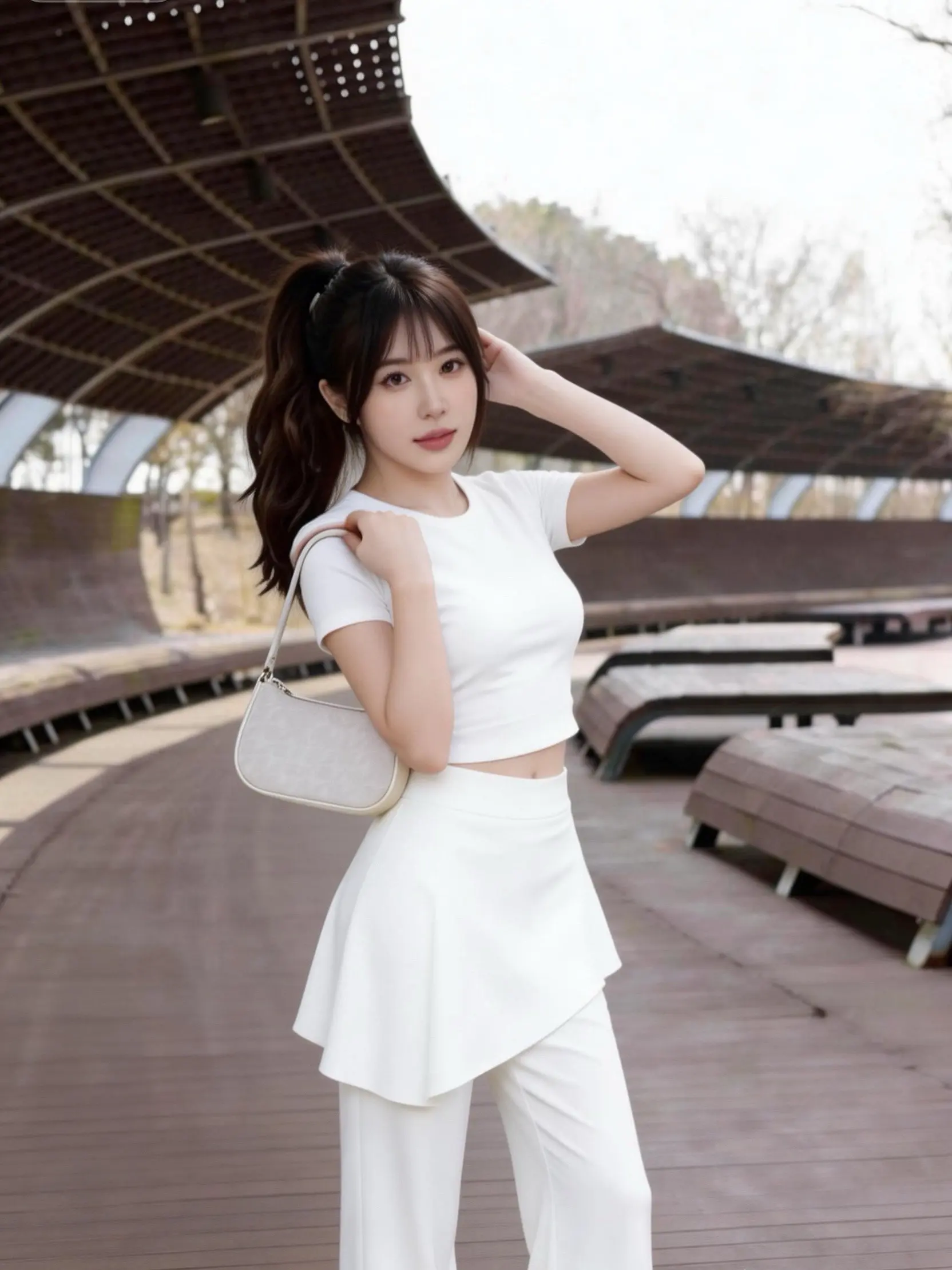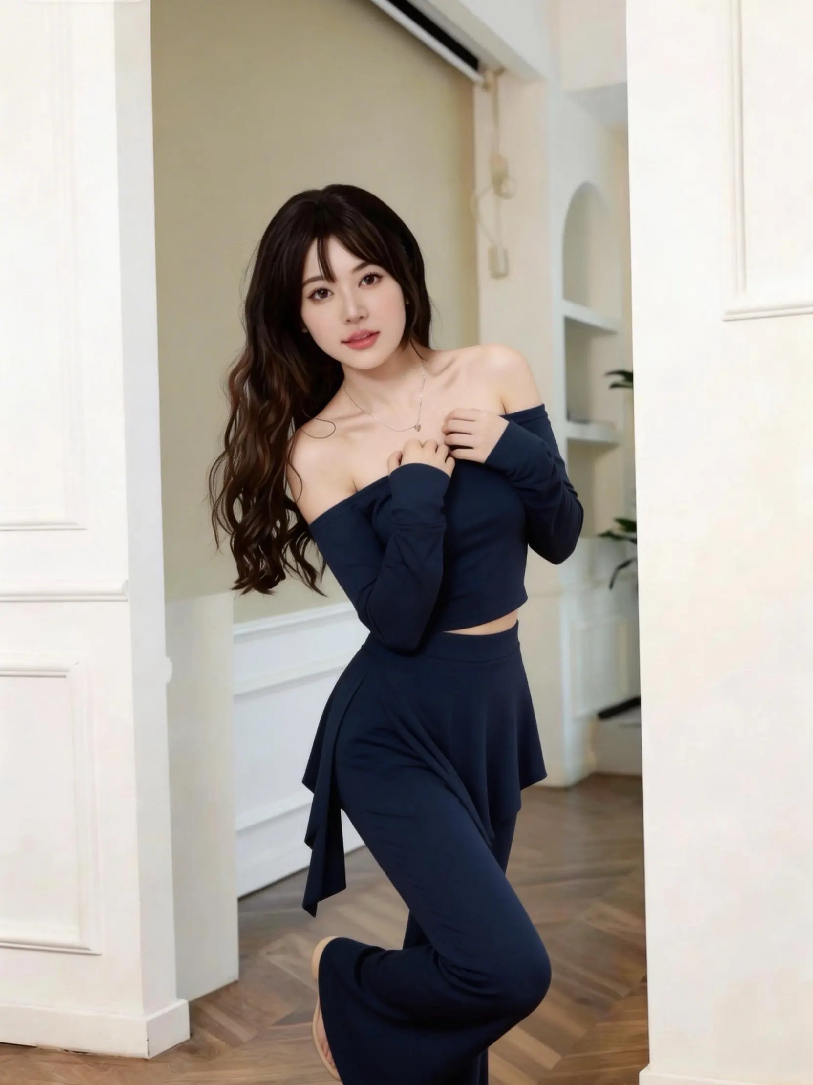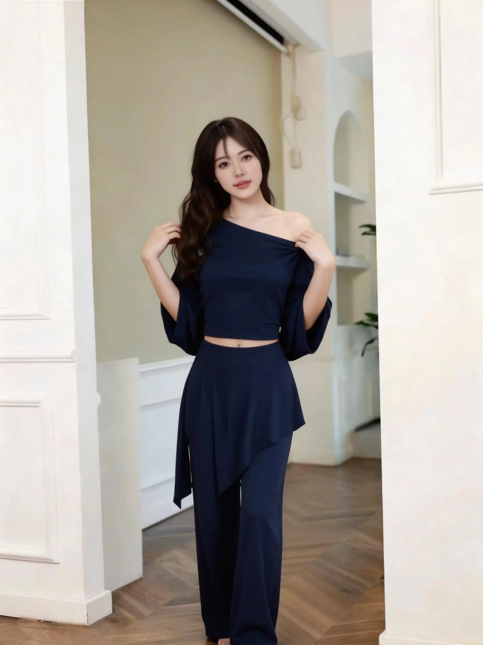 藏青色慵懒风套装。 一秒穿出纸片人!藏青色露肩套装,温柔感拉满!