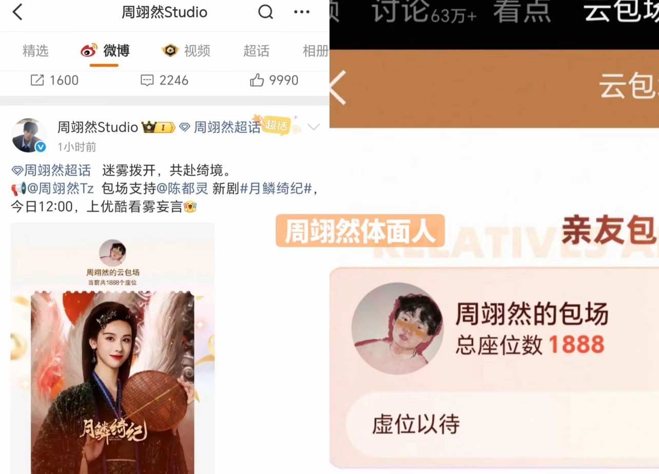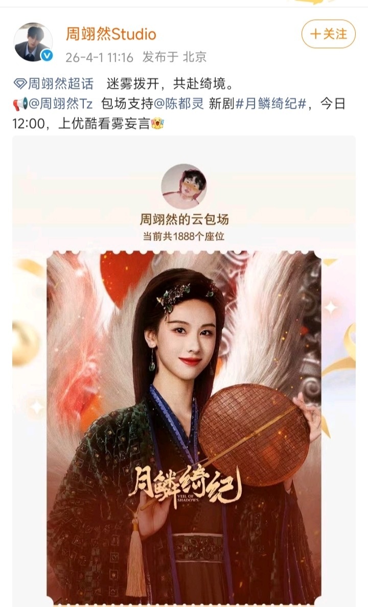 周翊然对身边的同事朋友永远都这么真诚,这么大方。《月鳞绮纪》亲友团里周翊然是云包场数量最多的人啊,有1888座这么多,周翊然怎么这么好啊!!!周翊然以前有认识的综艺活动同事或者剧组同事的电影或者剧上了,工作室不仅包场还会发微博帮忙宣传。期待周翊然待播剧:《翘楚》《生命缘》《我叫墨斗儿》