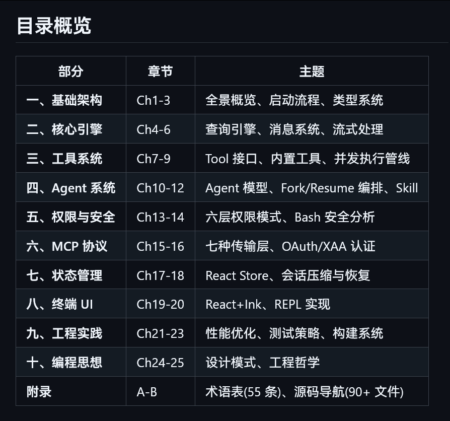 速度真快啊。Claude Code 源码刚发布没几个小时,这就有解析的书搞出来了github.com/sawzhang/deep-dive-claude-code应该是让AI模仿《Elasticsearch 源码解析与优化实战》《深入理解 Linux 内核》《C++ 编程思想》等经典技术书籍的架构风格,写了一本从源码层面系统剖析 Claude Code 代码的书。AI味较浓,仅供参考,下为介绍。----------------Claude Code 是 Anthropic 推出的命令行 AI 编程助手,也是目前业界最复杂的终端 AI Agent 实现之一。本书从源码层面,参考《Elasticsearch 源码解析与优化实战》《深入理解 Linux 内核》《C++ 编程思想》等经典技术书籍的架构风格,系统剖析 Claude Code 的设计思想与工程实践。核心特色: 所有分析基于真实源码引用,非泛泛而谈 101 个 Mermaid 图表(架构图、时序图、状态机、流程图) 467 个 TypeScript 代码块,带语法高亮和注释 深入到设计决策和工程权衡,不止于 API 描述