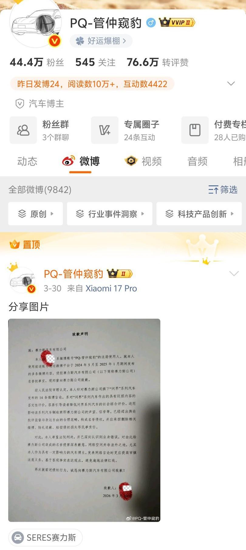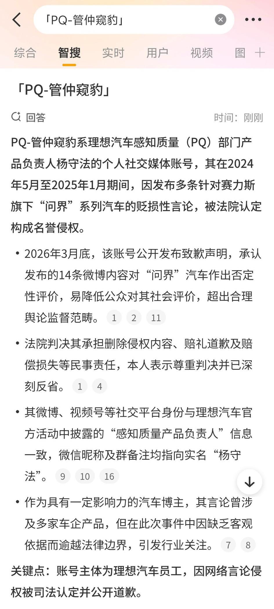 赛力斯法务还是太好说话了,友商的一个产品负责人在半年的时间内,发布了14条贬损问界汽车的言论,并已经被法院认定构成名誉侵权,而这个人仅仅是向赛力斯道歉和删除言论就了事,我看到都觉得赛力斯简直是太仁慈了。 我出于好奇,就在微博上搜了一下这个“PQ-管仲窥豹”的身份,微博平台说:“微博账号PQ-管仲窥豹的真实身份,是**汽车感知质量(PQ)部门产品负责人杨**。该账号因2024年5月至2025年1月期间,发布14条针对赛力斯旗下问界系列汽车的贬损性言论,被法院认定构成名誉侵权。”(详见文末微博截图) 以前,总是有人说余承东拉踩竞品什么的,结果现在法院裁定贬低问界的却是友商的部门负责人,这真的让人掉眼镜了。道歉信就这样置顶挂在“PQ-管仲窥豹”微博首页上,还不知道要挂多久,这让他的东家情何以堪啊?这样的员工,直接开除都挽回不了公司品牌价值的损害。赛力斯 问界