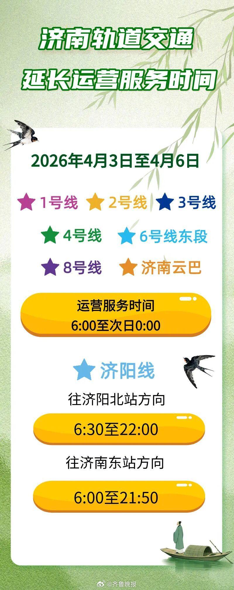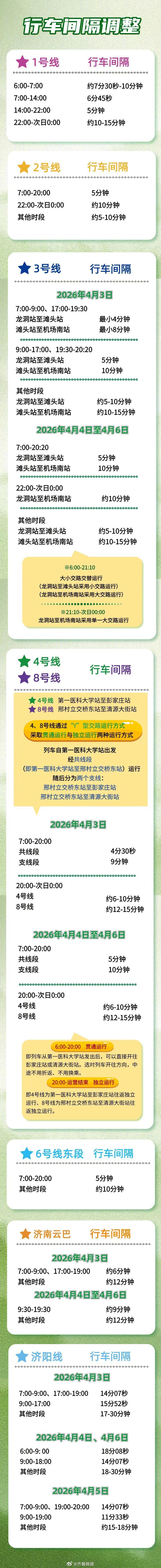 【#清明假期济南地铁延运最晚至零点#】清明假期将至,为满足市民乘客出行需求,济南轨道交通将在2026年4月3日至4月6日延长运营服务时间。4月3日至4月6日,列车到站时刻、发车时刻及行车间隔均有所调整 ↓↓