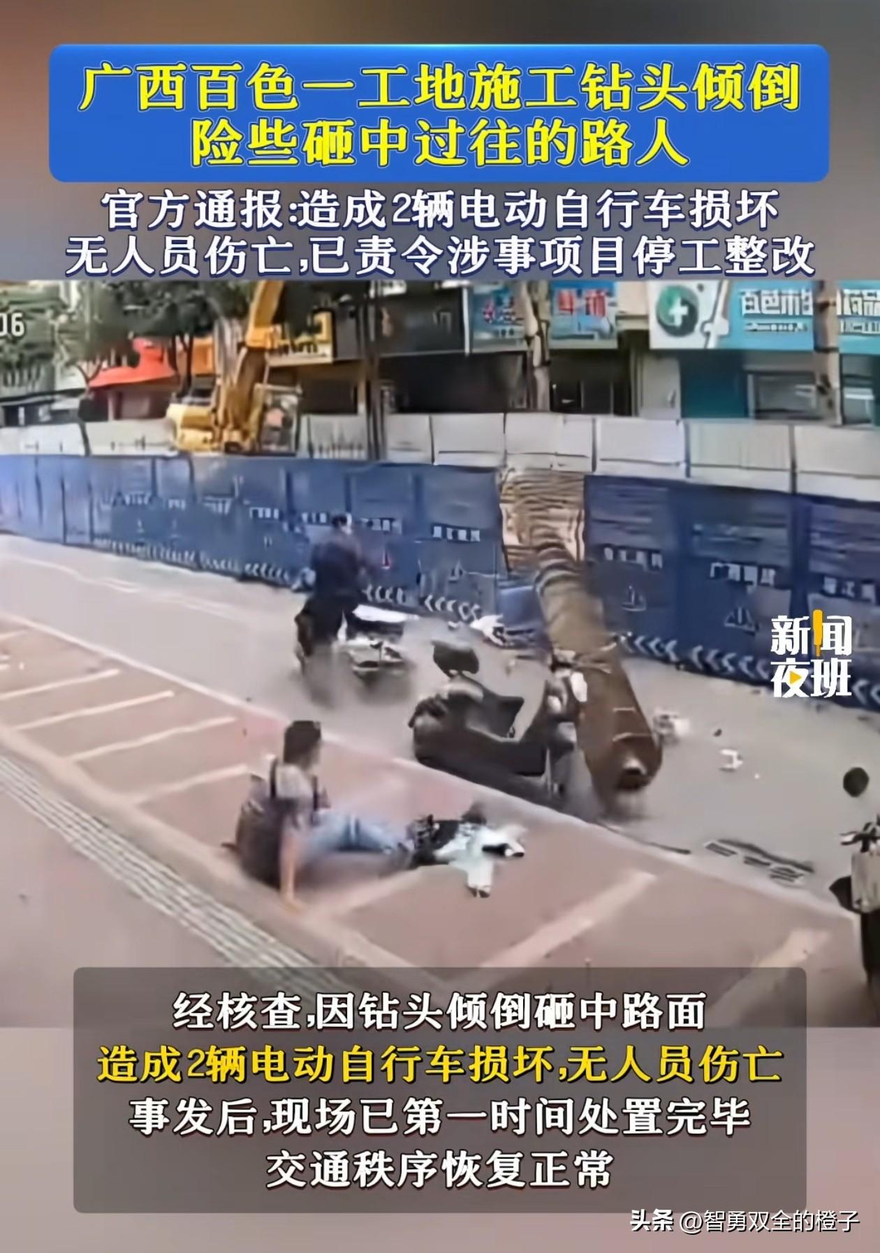 这两人的反应太快了! 广西百色,一处工地的巨型钻头突然倾倒砸向路边,幸亏路人神级反应,幸运躲过一劫,网友:祖坟冒青烟了。 从曝光的画面可以看到,两人都没有佩戴头盔,灰衣服男子提前察觉钻头要掉下来的迹象,但电瓶车速度太快,来不及刹车,他直接弃车跳了下来,再晚一秒可能就被砸中了。 黑衣男子更惊险,也更幸运,可能由于角度问题,钻头都快掉到他身前,他才发现,幸好他及时把身子往前只探,钻头砸中了电瓶车的后备箱。 估计现在最后怕的人,不是这两个男子,而是工地的负责人,真要是发生意外,估计要赔大了!