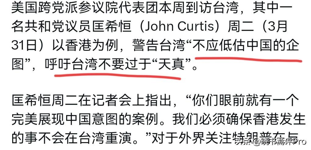 正在台湾窜访的美国共和党议员匡希恒对我们放话了!4月1日,匡希恒撂话声称,你们眼前就有一个完美展现中国意图的案例。我们必须确保香港发生的事不会在台湾重演。我想我对台湾最大的担忧,是他们低估了中国的意图。香港发生的事已经非常清楚地说明了一切。我们都希望和平,但请不要天真。 很显然,台湾问题是我们的内政,作为美国的执政党,共和党议员对中国的内政问题指手画脚,其所作所为摆明了就是要阻止我们实现国家统一。美国在破坏和平,制造动荡局势方面,全球各国都看在眼里。美国现在所扮演的角色,绝对不会促进台海和平。 美国议员嘴巴里面说和平,那在中东怎么就没有和平呢?这种嘴脸可以说极度虚伪。我们对美国想要打台湾牌的意图,不会有一丝一毫的天真。在我们清理了香港的反华势力之后,香港变得越来越和平,越来越稳定。美国在香港也越来越难以兴风作浪了。 美国政客口中的“不要天真”,不过是想恐吓台湾民众,让台湾心甘情愿充当美国遏制中国的棋子,心甘情愿被绑上美国的战车。但是,不管是乌克兰,还是美国对待中东盟友,还是在格陵兰岛等问题上,各国都明白了,美国谁也保护不了,美国只会牺牲盟友利益、维护自身霸权的人。相信美国既危险,又致命。我们当然也绝对不会允许美国干涉我们的内政。