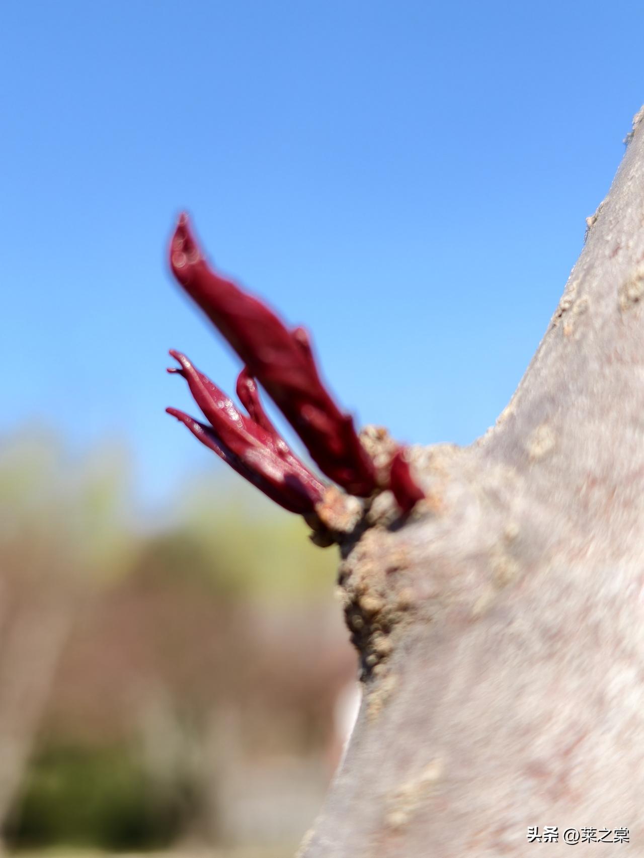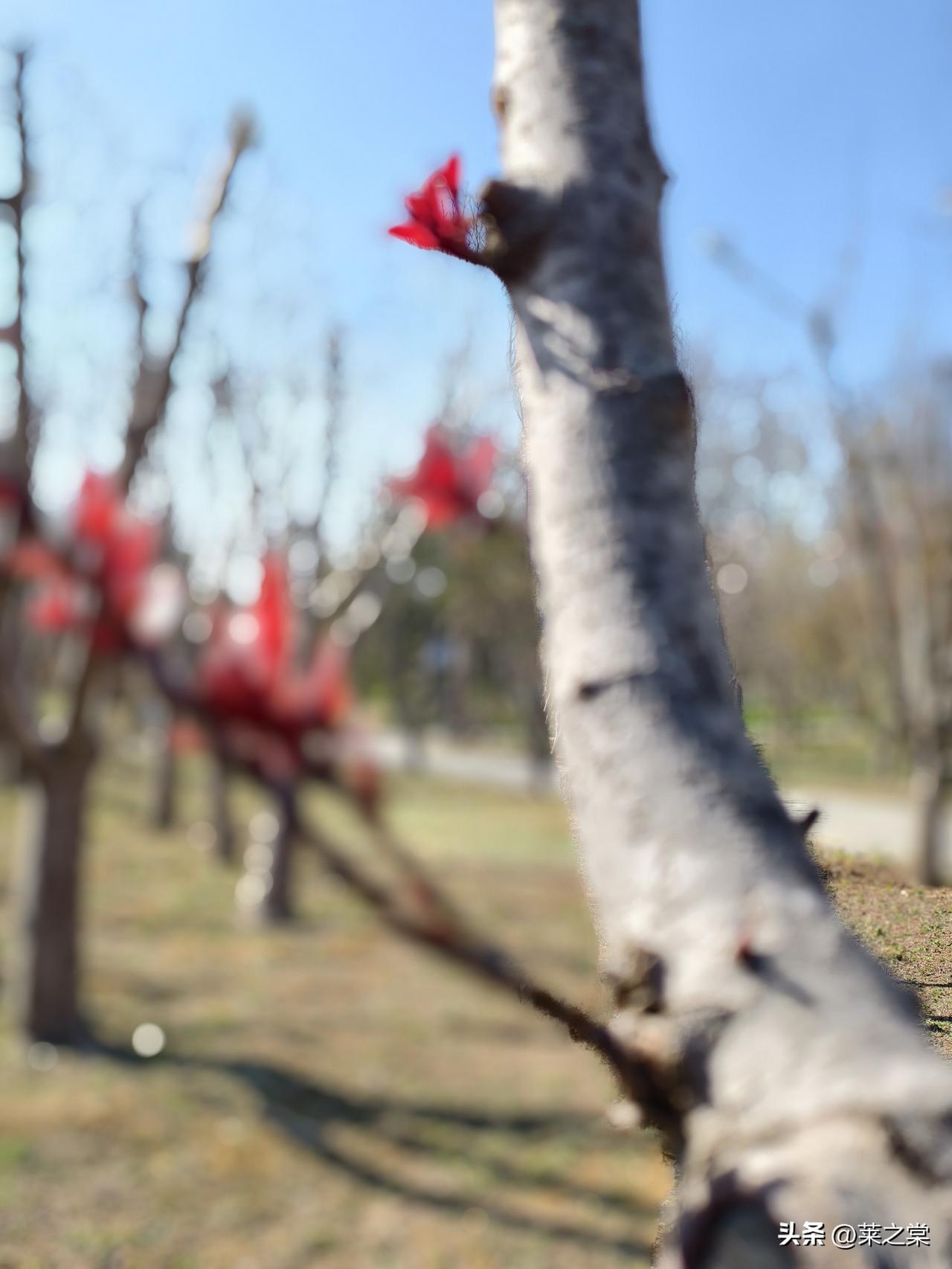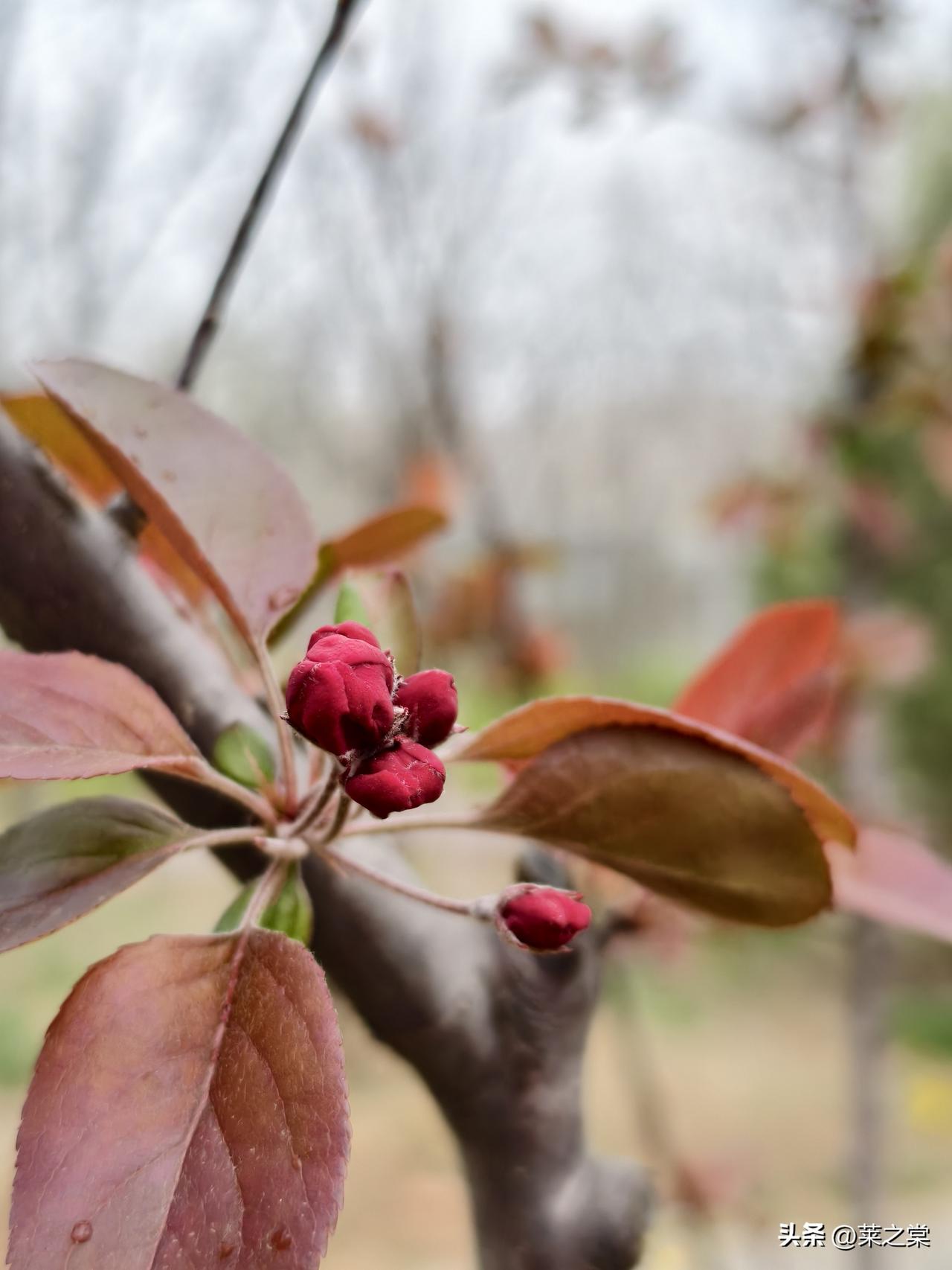 南海子春行 鹿囿春深曲岸西, 含苞待放赤霞低。 新芽迸地燃丹火, 老干擎天化铁藜