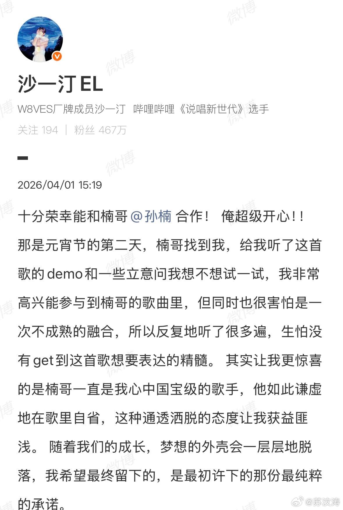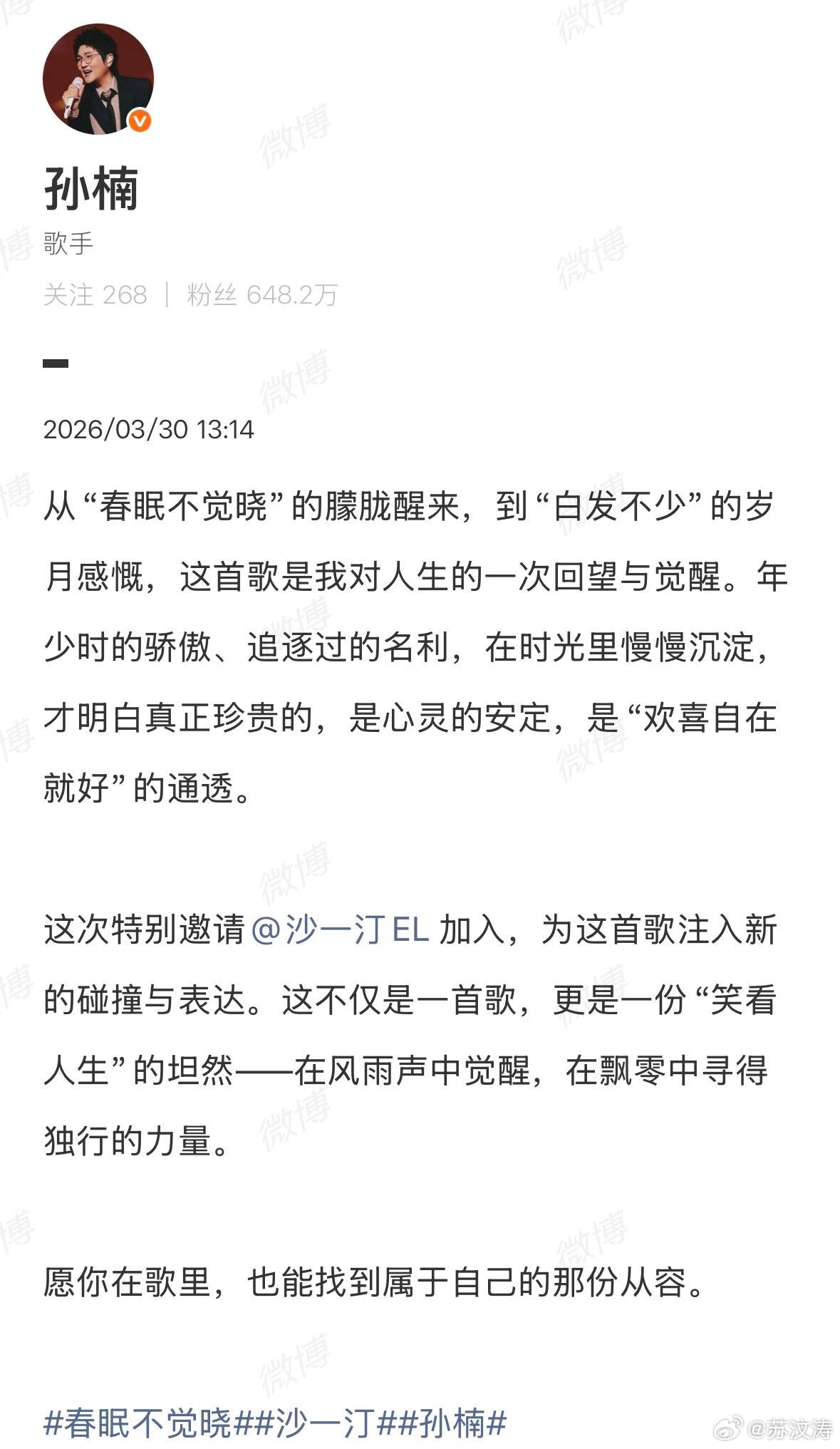 孙楠沙一汀合作新歌虽然今天是愚人节但真不开玩笑!沙一汀和孙楠居然合作了新歌《春眠不觉晓》!并且已经上线了!如此跨界且小众的文字,居然是真的!单从歌词里能就能清晰get到两位歌手把对人生的思考与感悟都写进了旋律!从发布的博文两位更是开启夸夸模式!沙一汀也是从当初合照底下那句“全天下最幸运的小男孩是谁”,到如今凭实力被前辈认可、拿下合作feat!这下真的是全天下最幸运的小男孩喽!