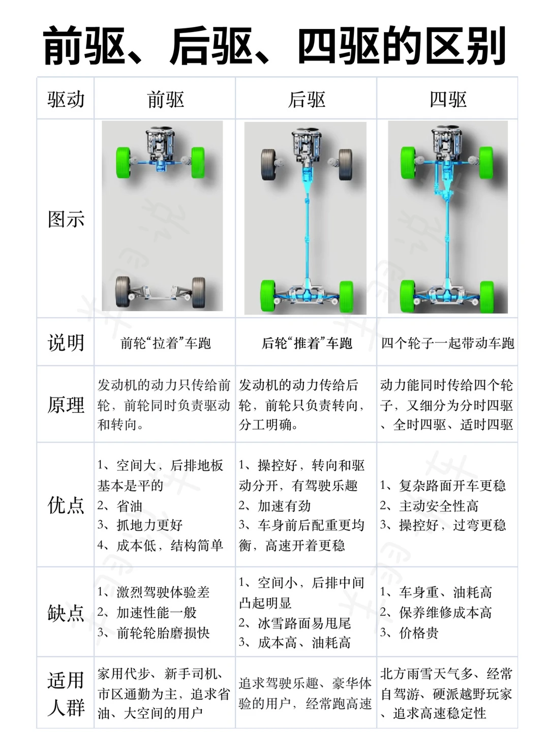驱动形式,就是动力传给哪个轮子,让哪个轮子带动车跑,分为前驱、后驱、四驱三大类,每一类的驾驶体验、适用场景完全不同。