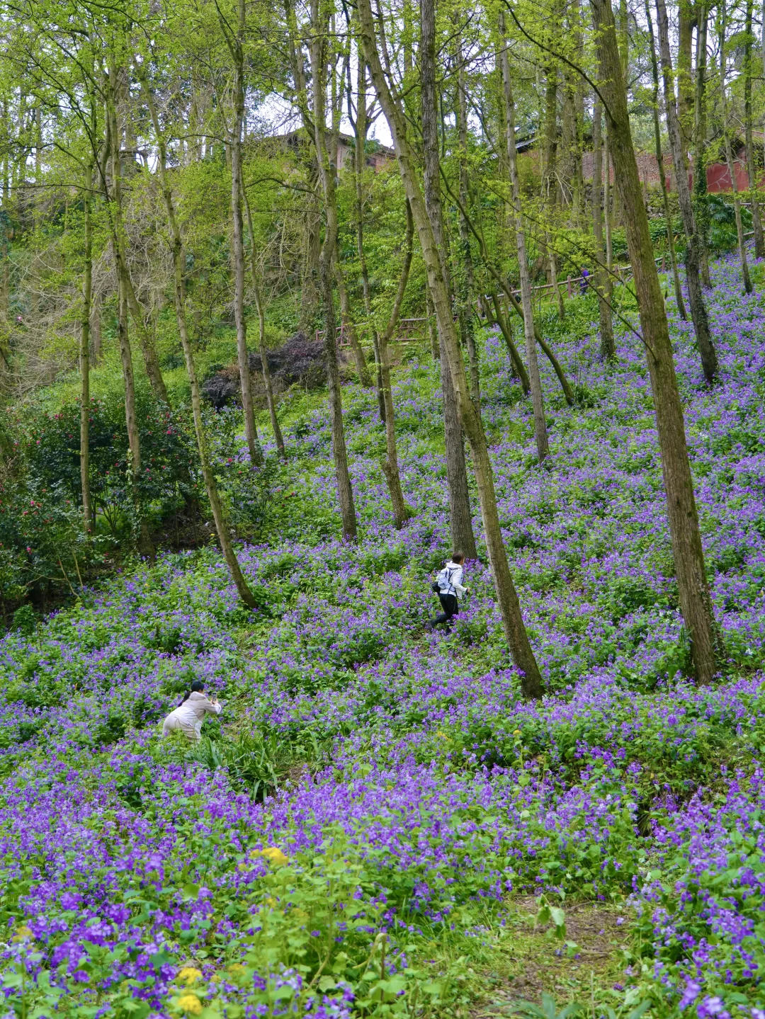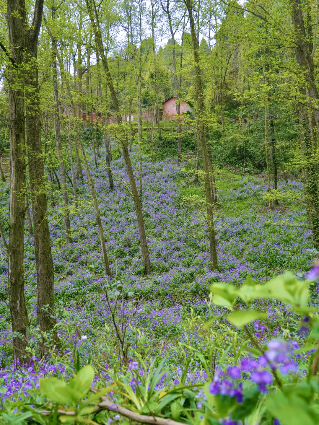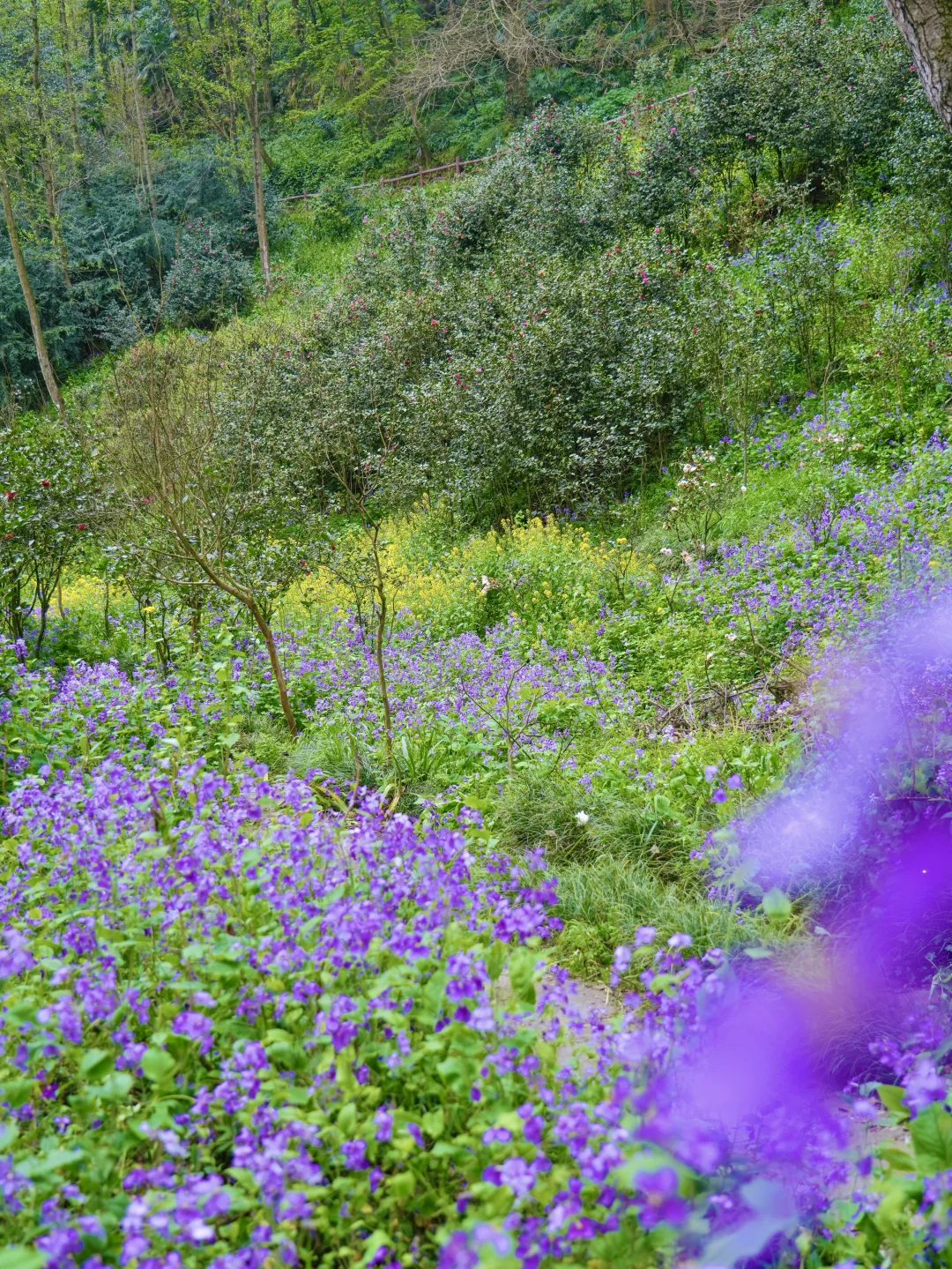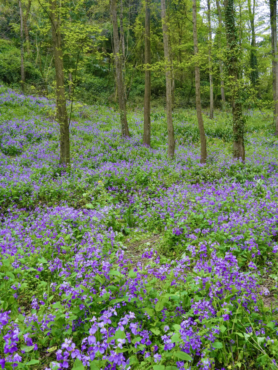 在这里徒步,每一步都是脚下生花的感觉! 二月兰花期长,春假清明去正合适!徒步距离也不长,大约4公里多,不想走就直接去赏花不走完 拍照出片,进去一路上都是花,樱花🌸茶花、二月兰、扁竹梗花……很大片 图片中的二月兰大多数都是在北寨门方向的山坡下拍的,谷底和山坡上都是,很好找哦~ 📍彭州葛仙山 🎫门票:🈶