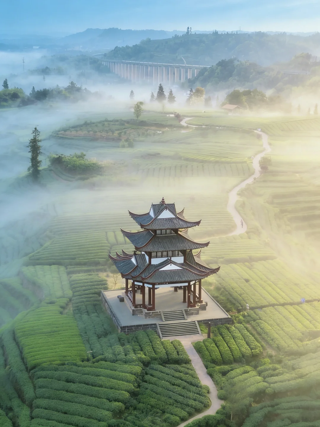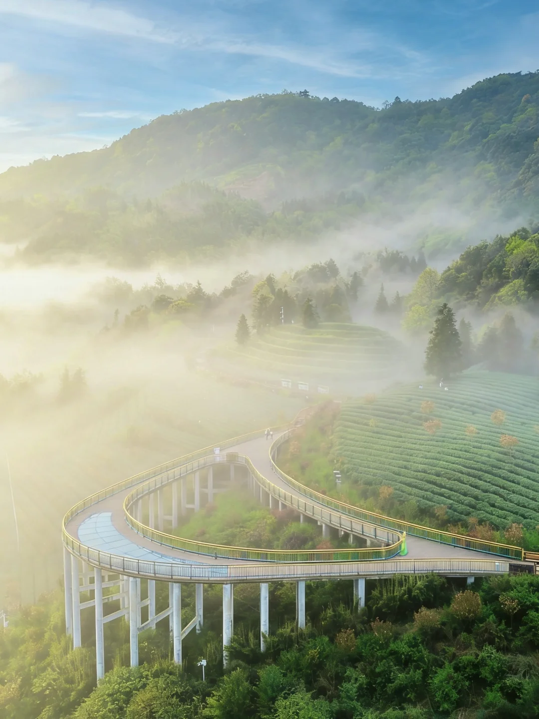 5️⃣凌云台+天吉吊桥:270°观景台,俯瞰云海茶山,雾气缭绕,拍照仙气飘飘