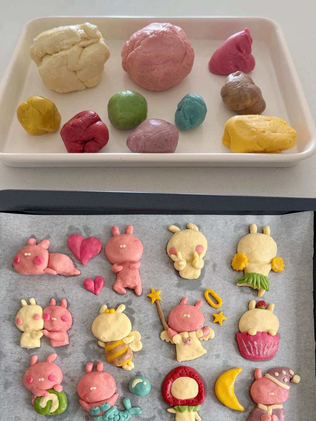 4️⃣面团分块上色(这里我用到了仙人掌果粉,可可粉,可食用白色色素,红丝绒液,抹茶粉,南瓜粉,可食用蓝色色素等)